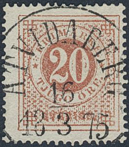 Sweden. Facit 22 used, 20 öre orange. Excellent cancellation ÅTVIDABERG 16.3.1875.