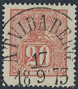 Sweden. Facit 16g used, 20 öre red-dull red. Excellent cancellation ÅTVIDABERG 17.9.1873.