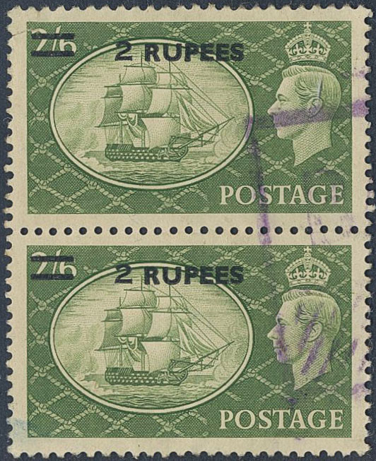 Bahrain, British protectorate. Official SG 41a used, 1950 2r on 2s 6d green type 2 pair. GBP 130