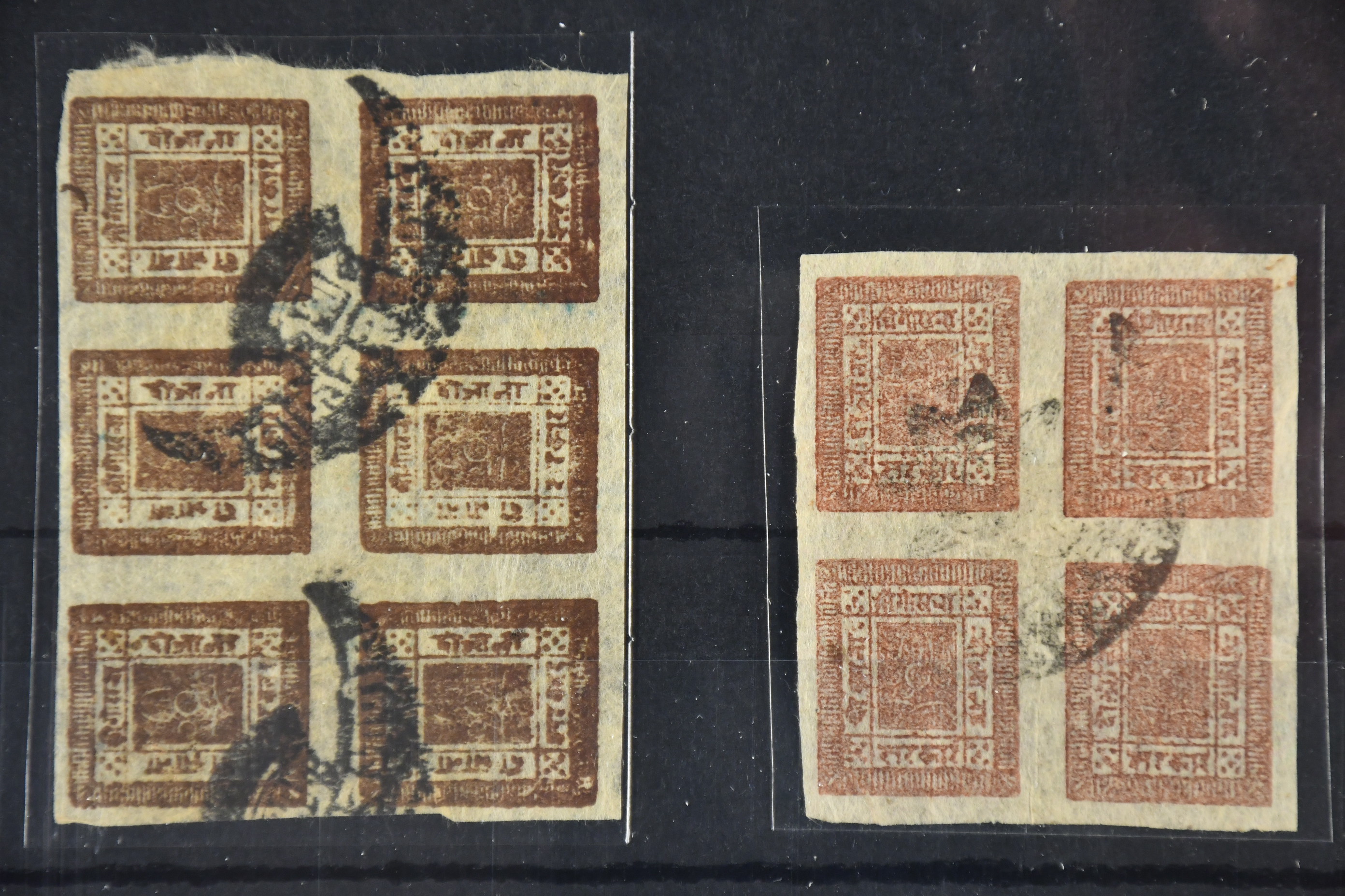 Nepal. SG 39–40 used, 1917-30 2 a maroon block of 4 and 2 a brown block of 6. GBP 160