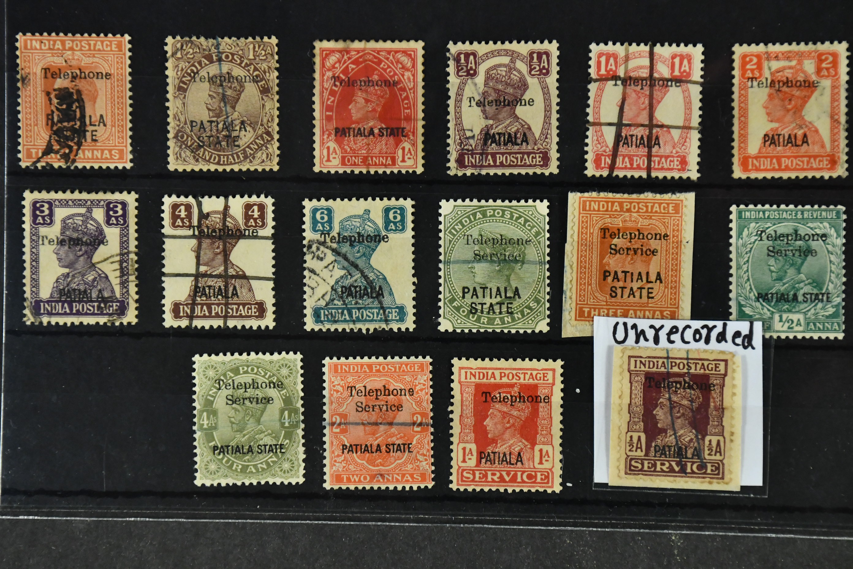 India, Patiala. Used. Small lot all overprinted "Telephone". One ½ a – unlisted by SG. (16).