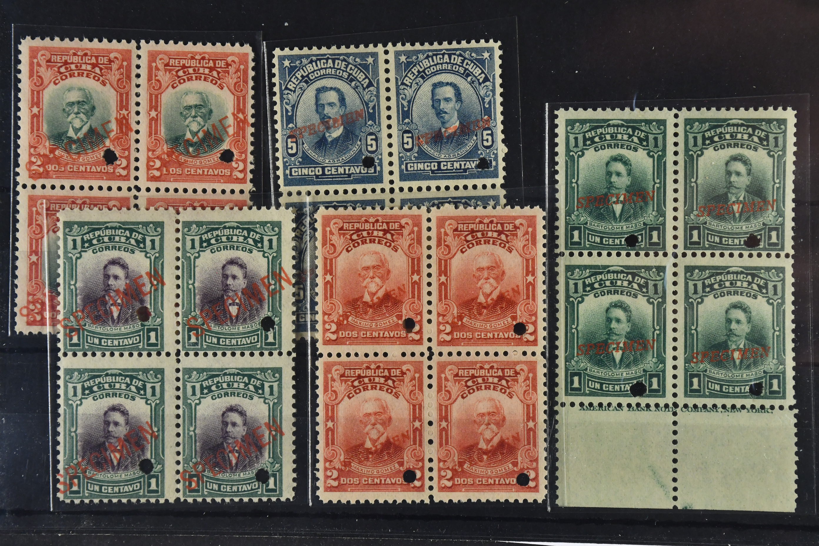 Cuba. ★★. Small lot SCOTT 239–248 1910–11 overprinted SPECIMEN, all in block of 4. (5).