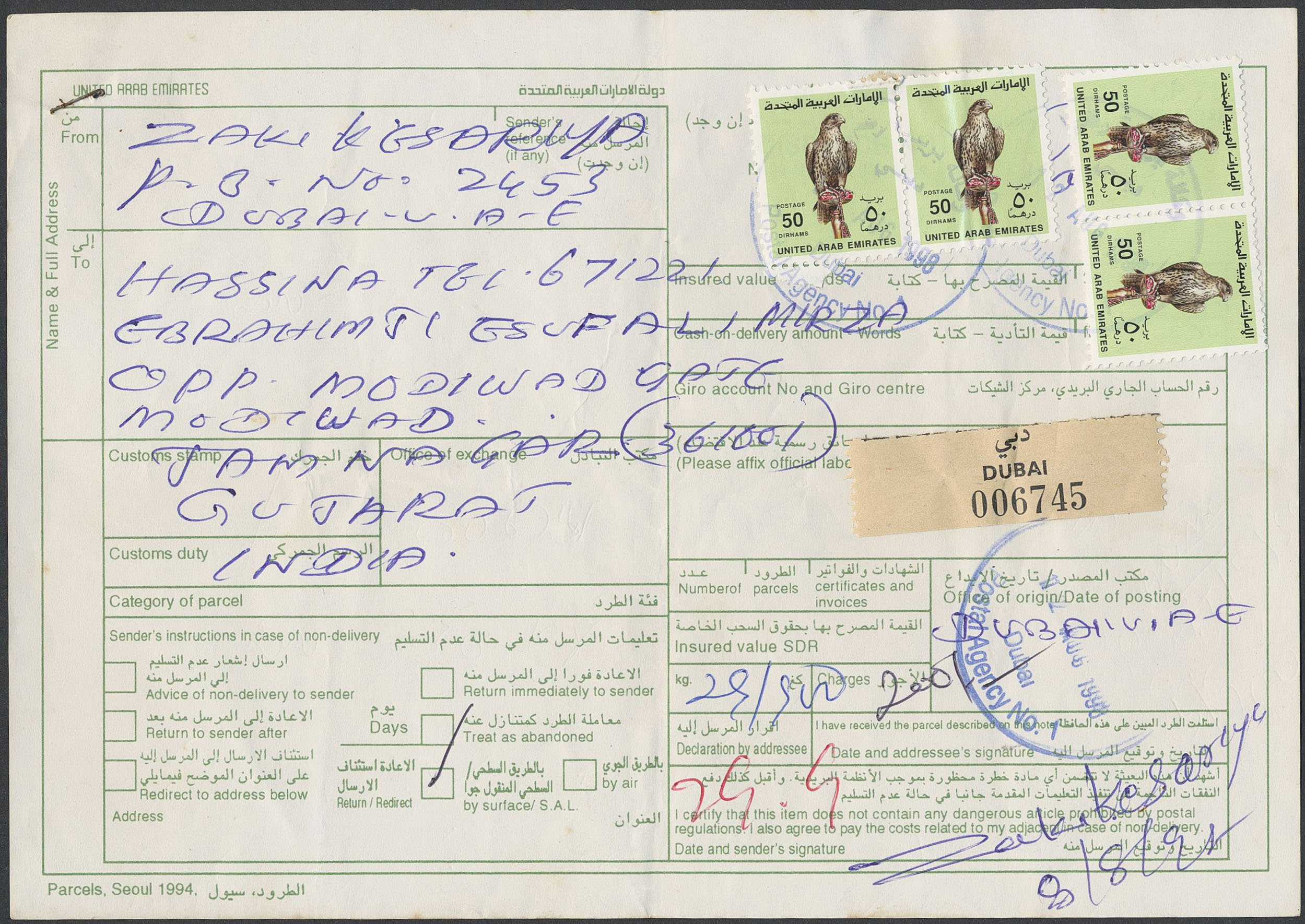 United Arab Emirates. Cover, 1990 Falcon 50d x 4 on parcel card sent registered from Dubai to India.