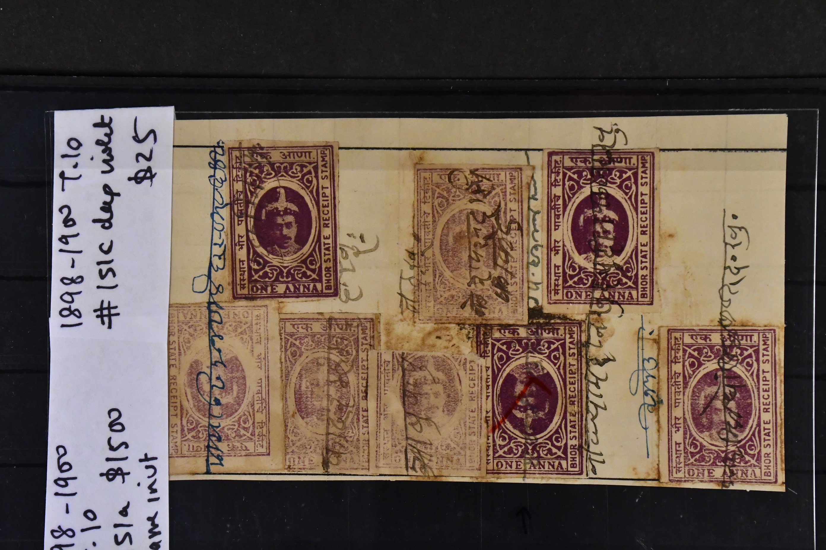 India, Bhor. Used, 1898–1900 1a revenue x 8 with inverted frame used on part wages ledger page. KM 151a cv us 1500.