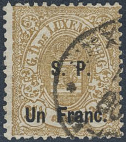 Luxembourg. Official Michel 26 II used, 1882 S.P. on Coat of Arms 1 Fr on 37½ c yellow-brown overprint thick type. EUR 300