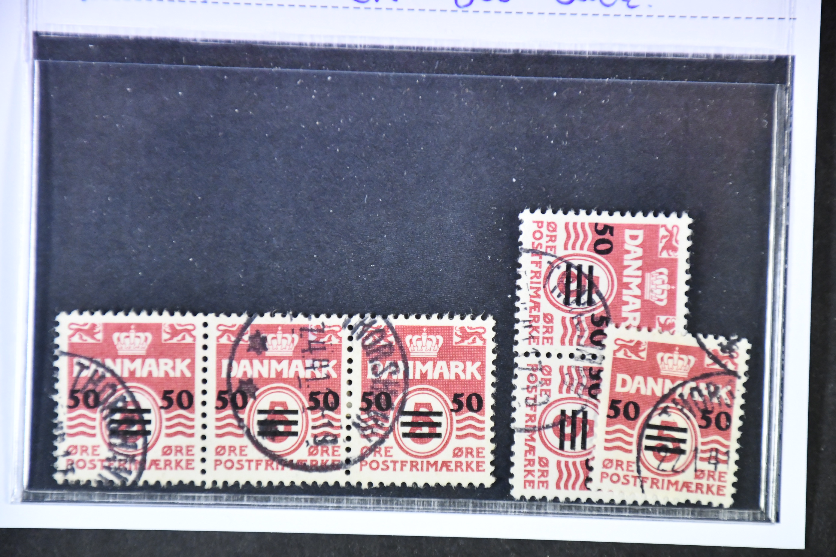 The Faroes. Facit 7 or Scott 5 used, 1940 Surcharge on Wavy-lines 50 / 5 øre wine-red. 6 examples, all with owners mark "ek" on back side. Incl. one strip of 3. SEK 3900