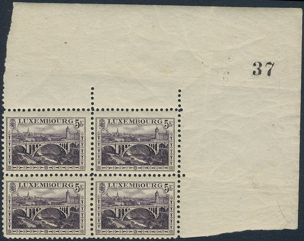 Luxembourg. Michel 136A ★, 1921 Landscapes 5 Fr dark violet perf 11½ × 11. Block of four with upper right margin. EUR 220