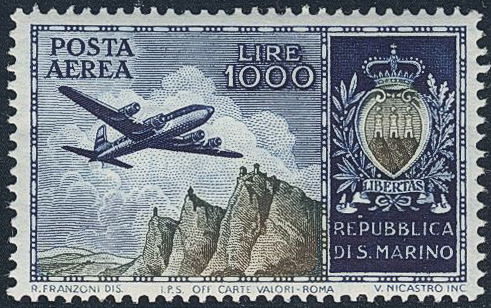 San Marino. Michel 512 ★★, 1954 Air mail 1000 L multicoloured. EUR 140