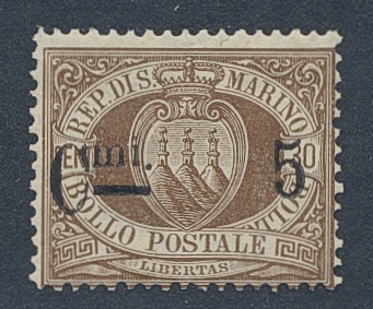 San Marino. Michel 9 ★, 1892 New value overprint 5 c on 30 c brown. EUR 350