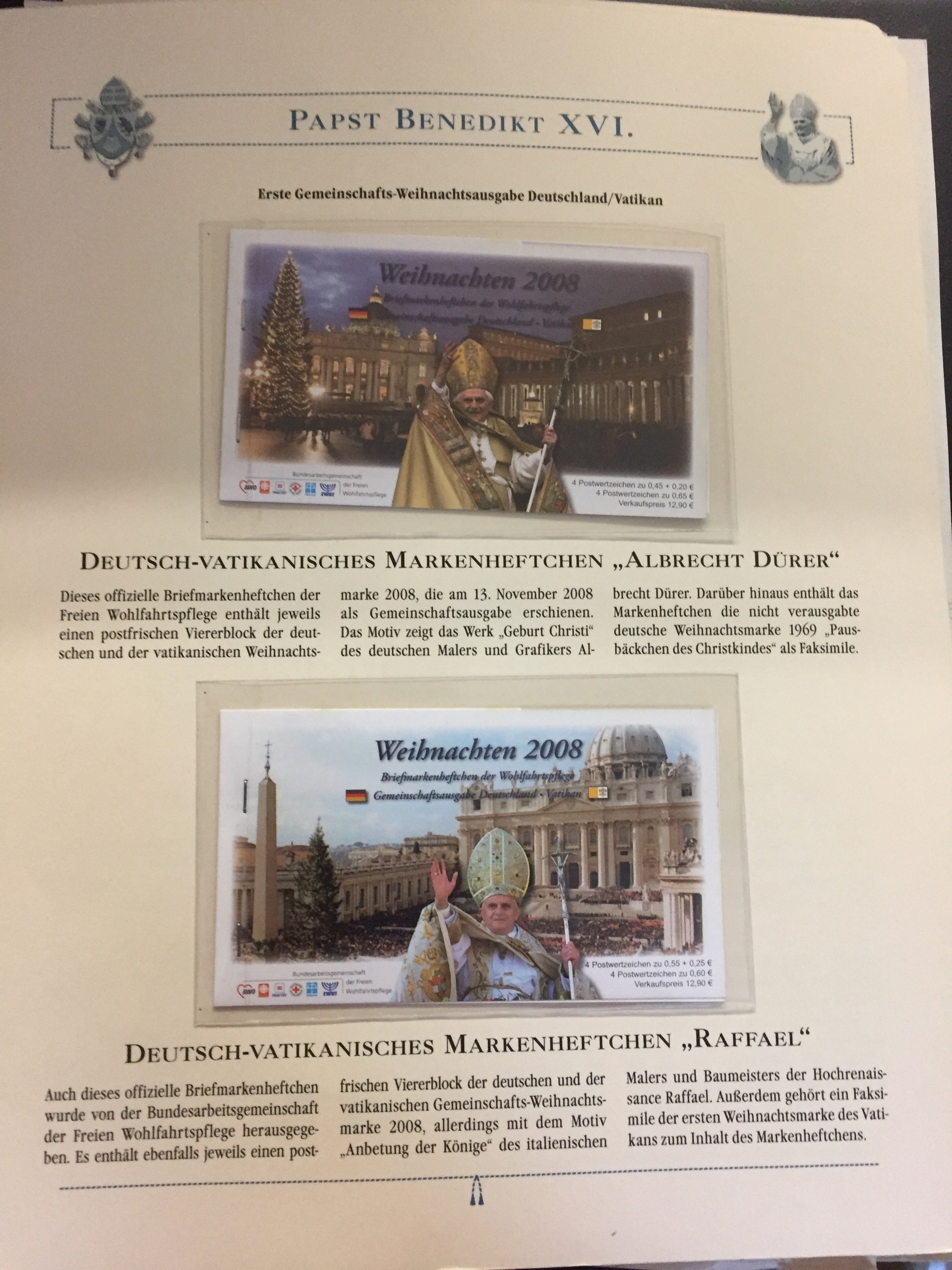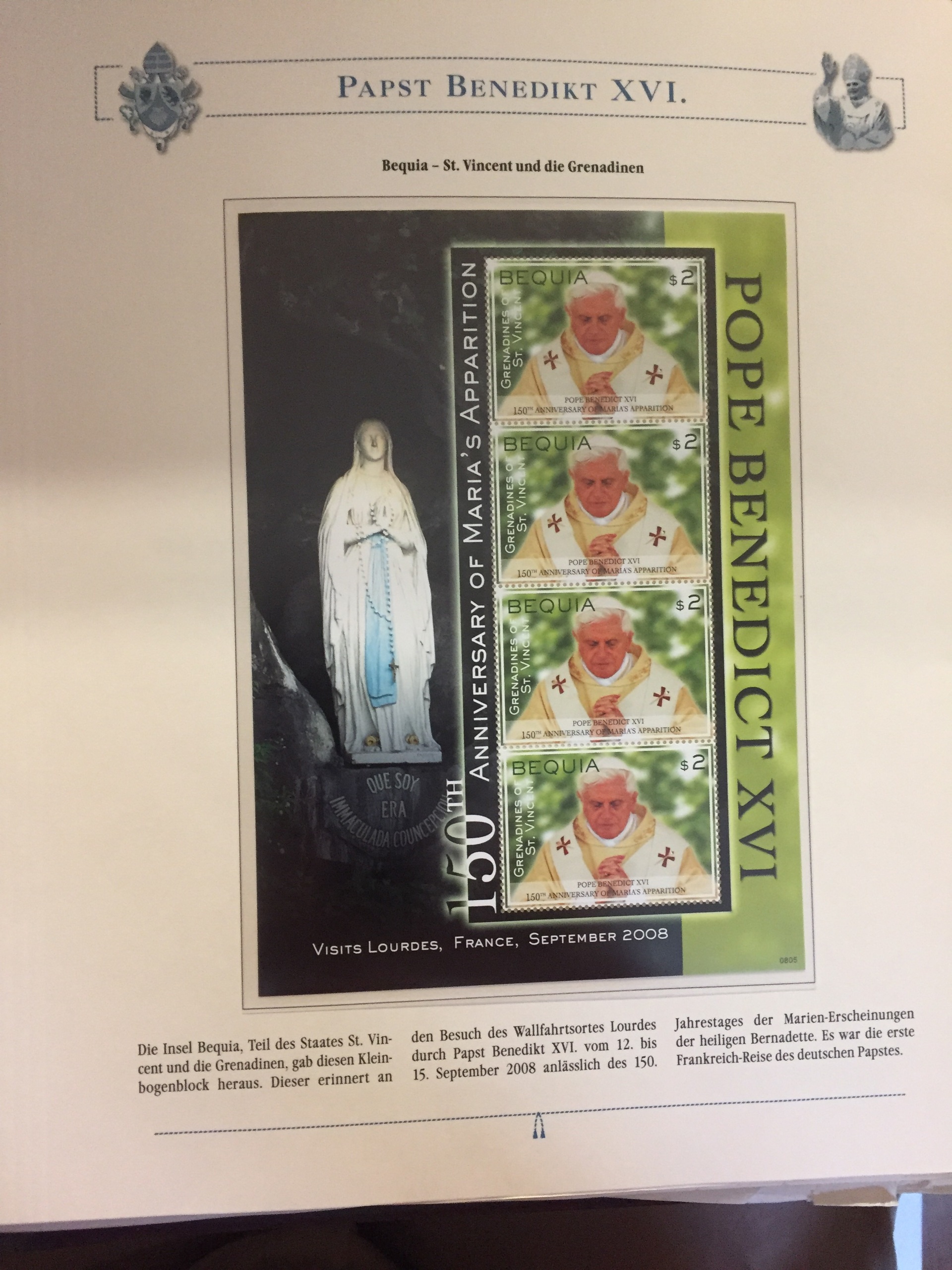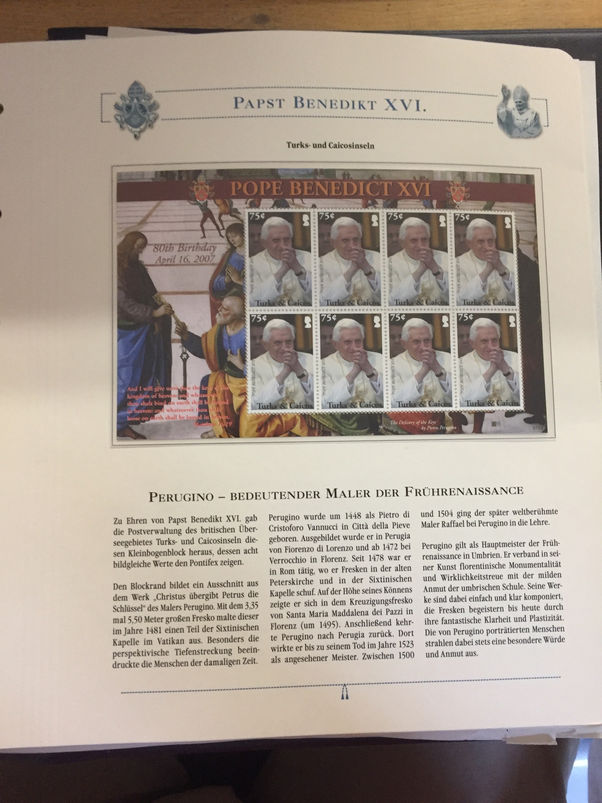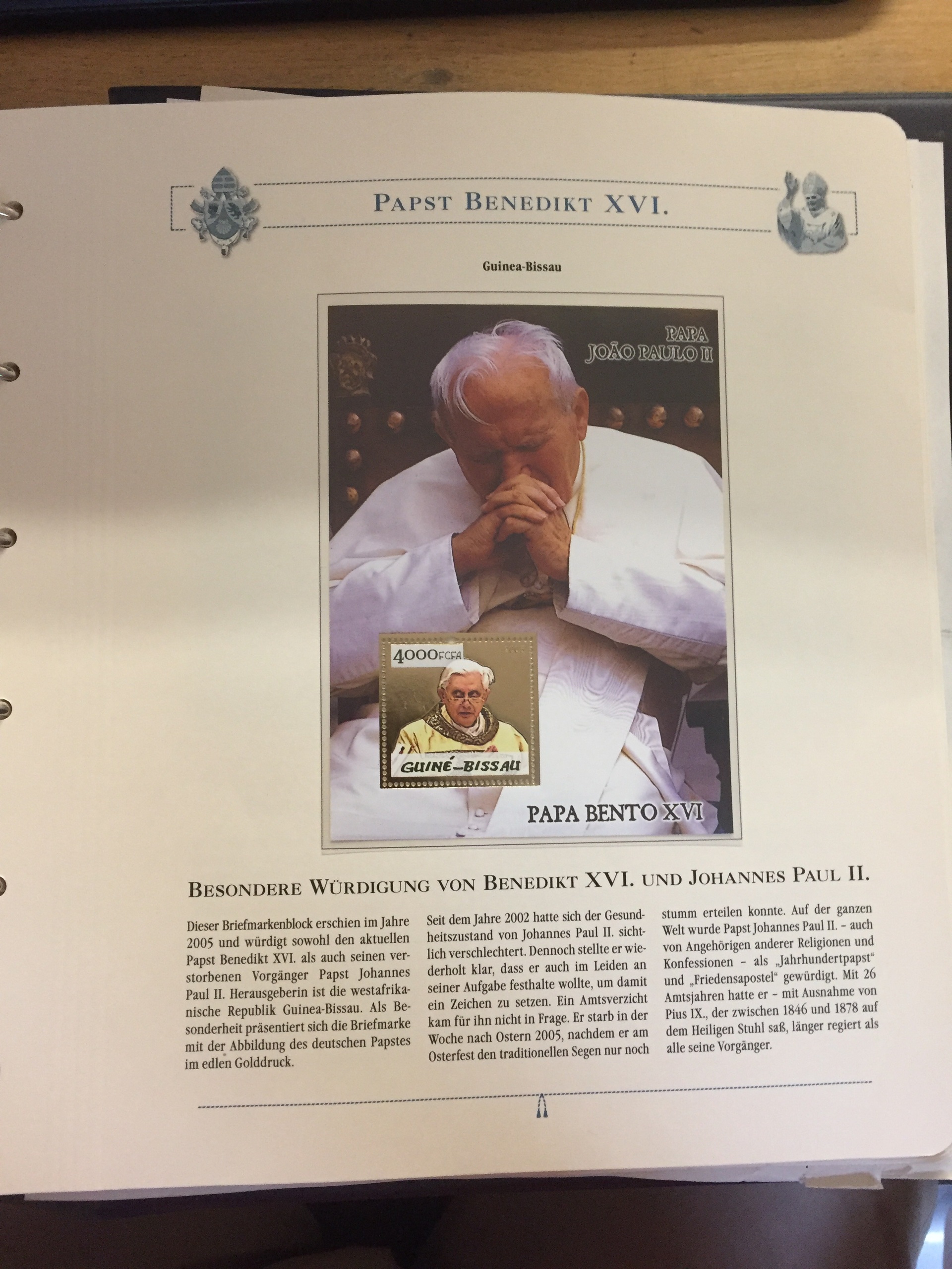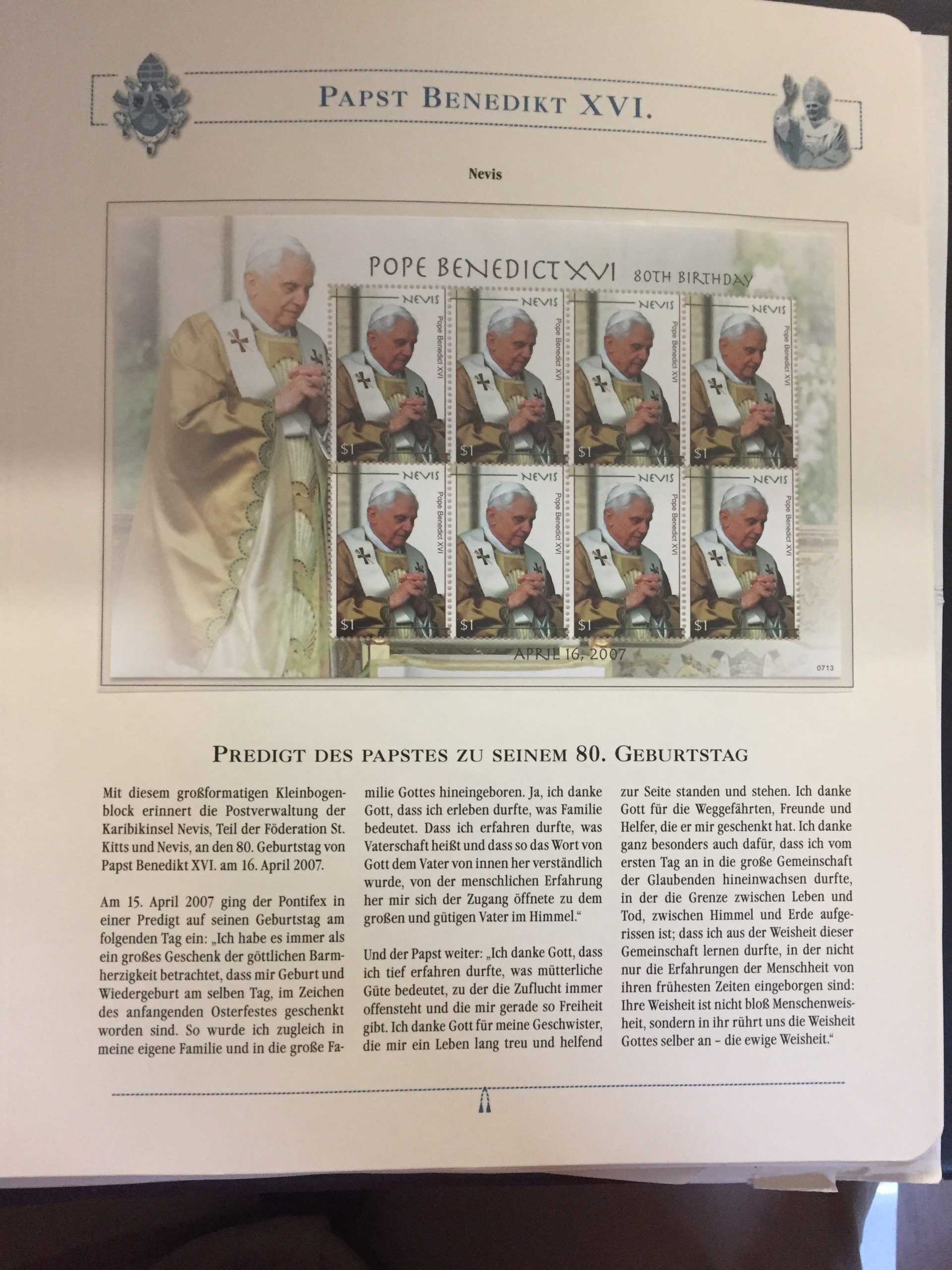 Thematics, Pope Benedict XVI. ★★. Beatifiul collection in 4 large Borek special albums with lots of information. Stamps, s/s, minisheets and some covers from 2006 up to 2017. Seems to be complete with many difficult issues – many in gold or silver – from many differernt countries. Also another album with other popes in the same type of album. Excellent quality. (several hunded)
