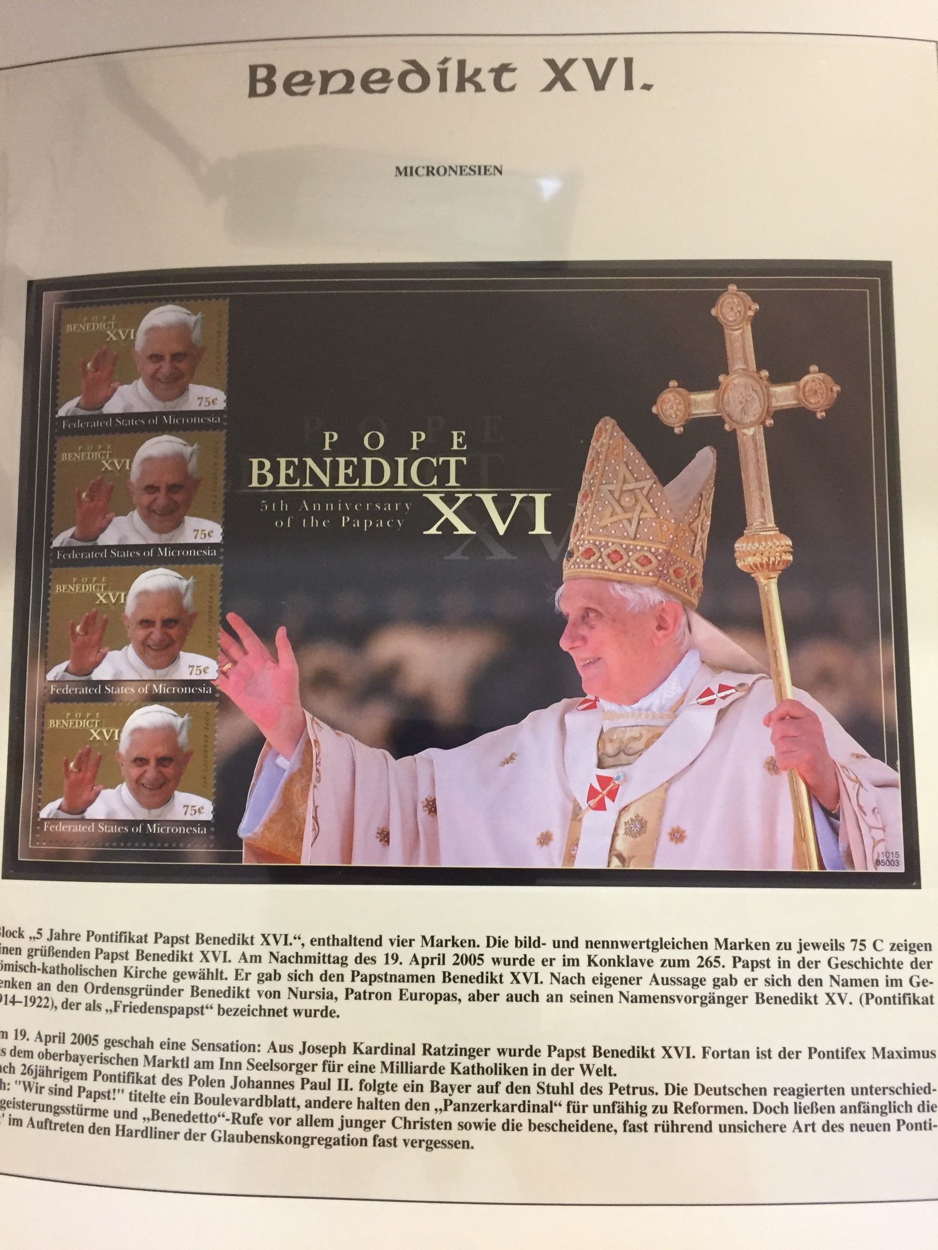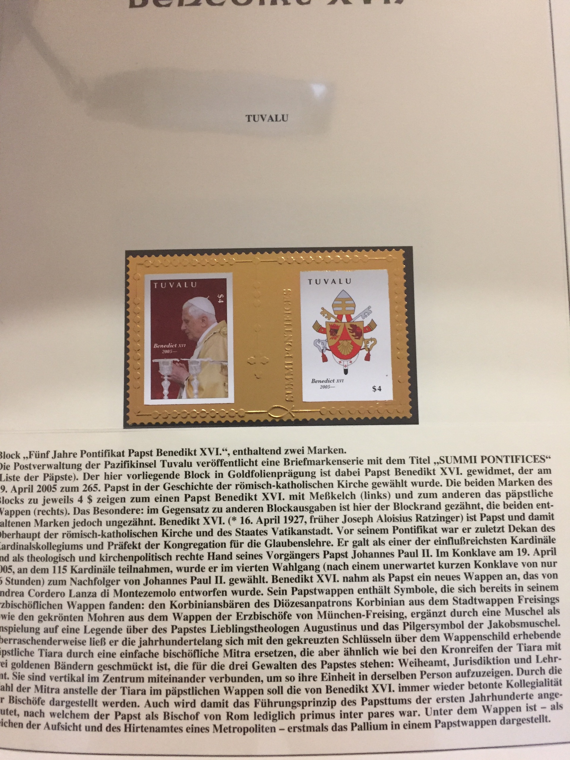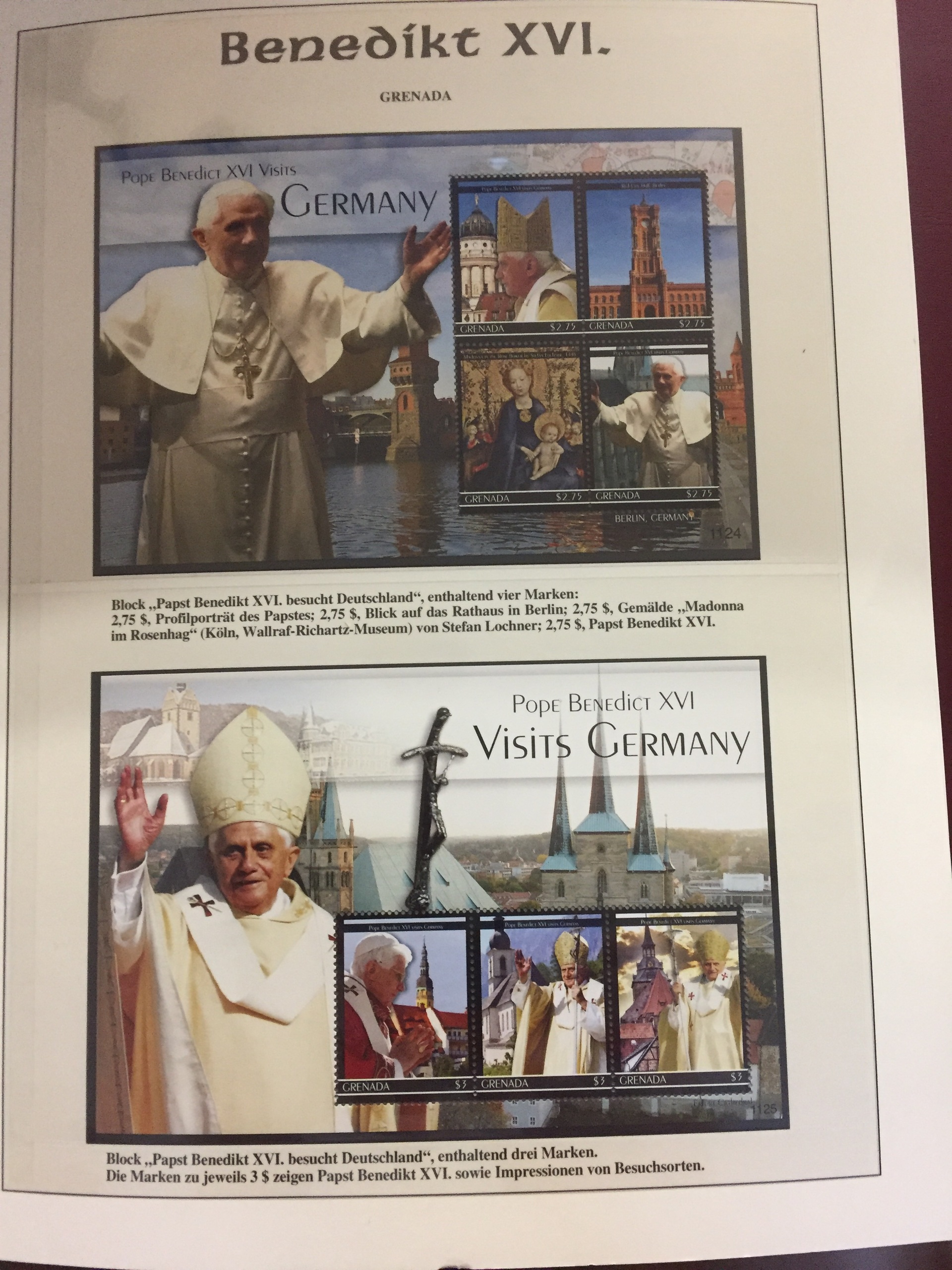 Thematics, Pope Benedict XVI. ★★. Beatifiul collection in 3 large Sieger special albums with lots of information. Stamps, s/s, minisheets and some covers from 2006 up to 2017. Many difficult issues – many in gold or silver – from many differernt countries. Excellent quality. (several hunded)