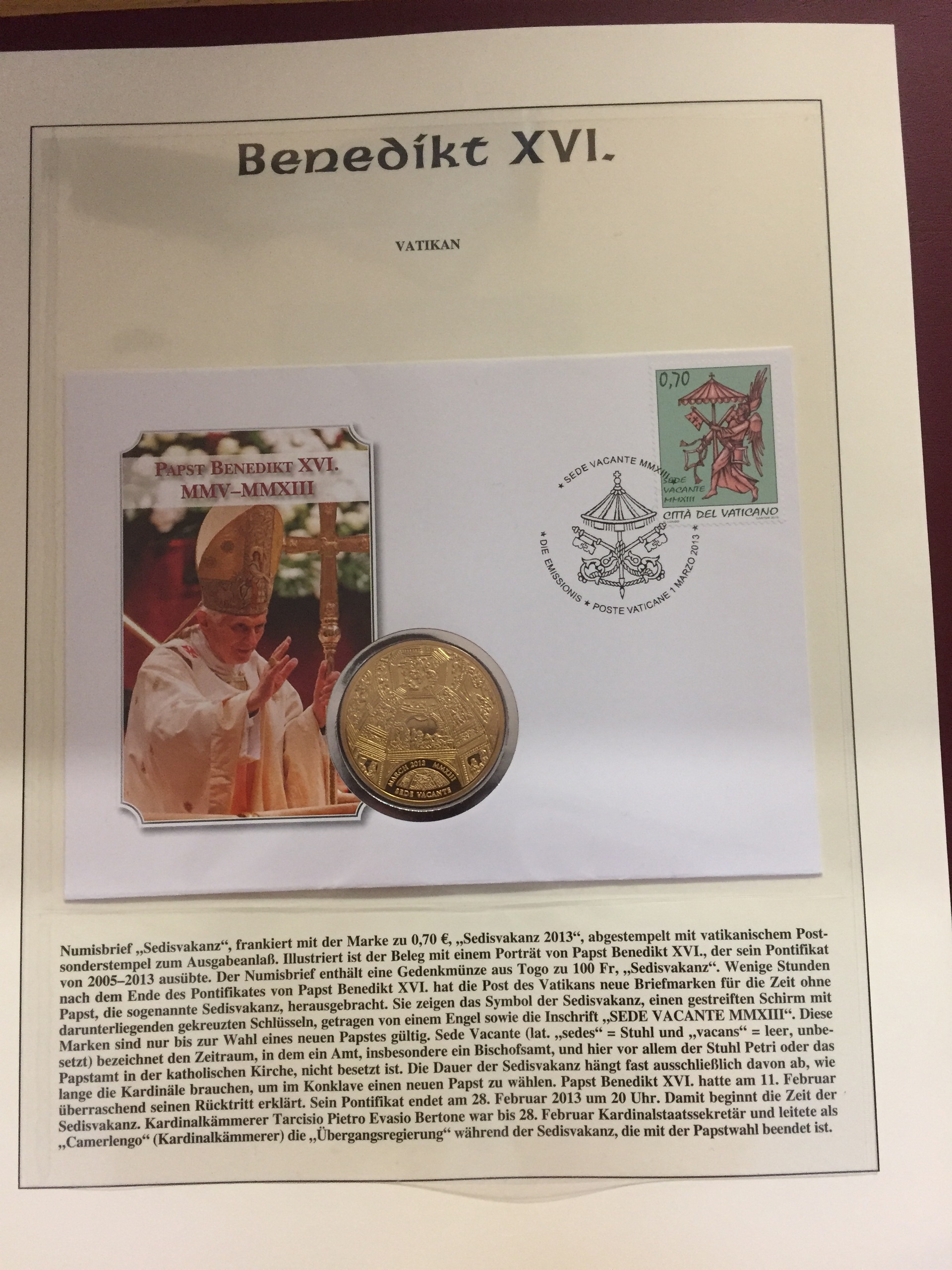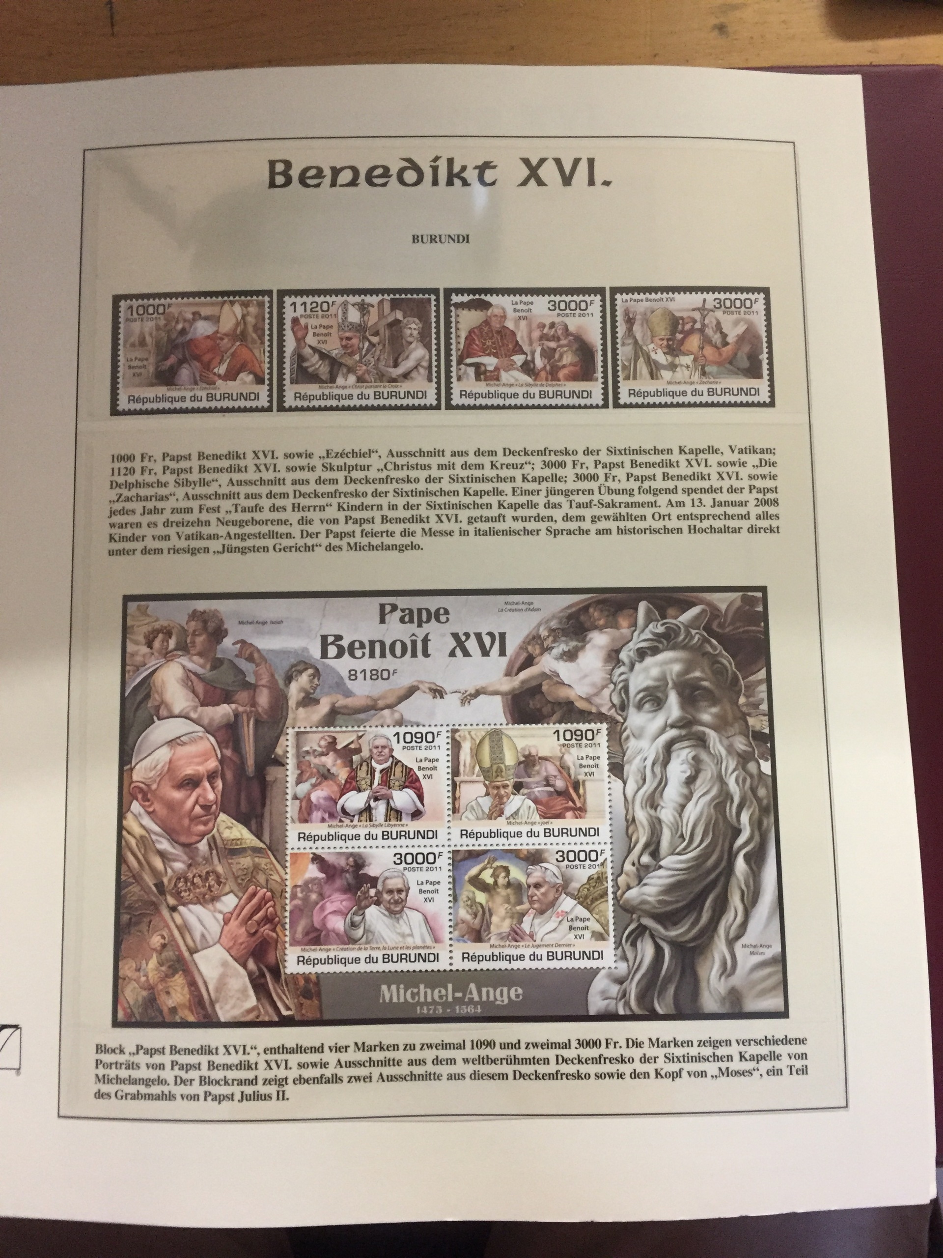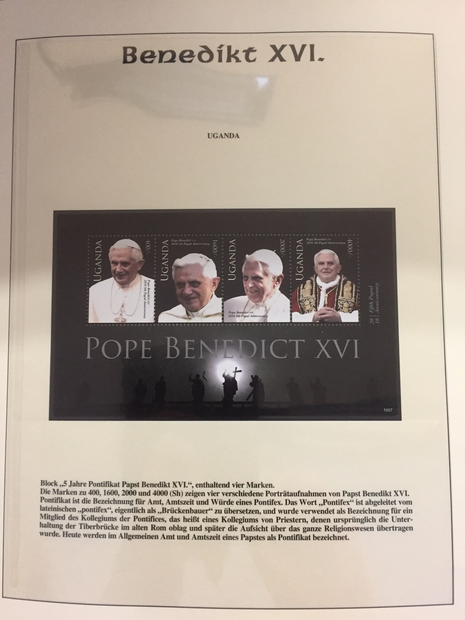 Thematics, Pope Benedict XVI. ★★. Beatifiul collection in 3 large Sieger special albums with lots of information. Stamps, s/s, minisheets and some covers from 2006 up to 2017. Many difficult issues – many in gold or silver – from many differernt countries. Excellent quality. (several hunded)