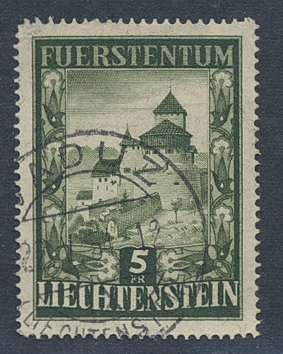 Liechtenstein. Michel 309 used, 1952 Vaduz Castle 5 Fr green (1). EUR 260