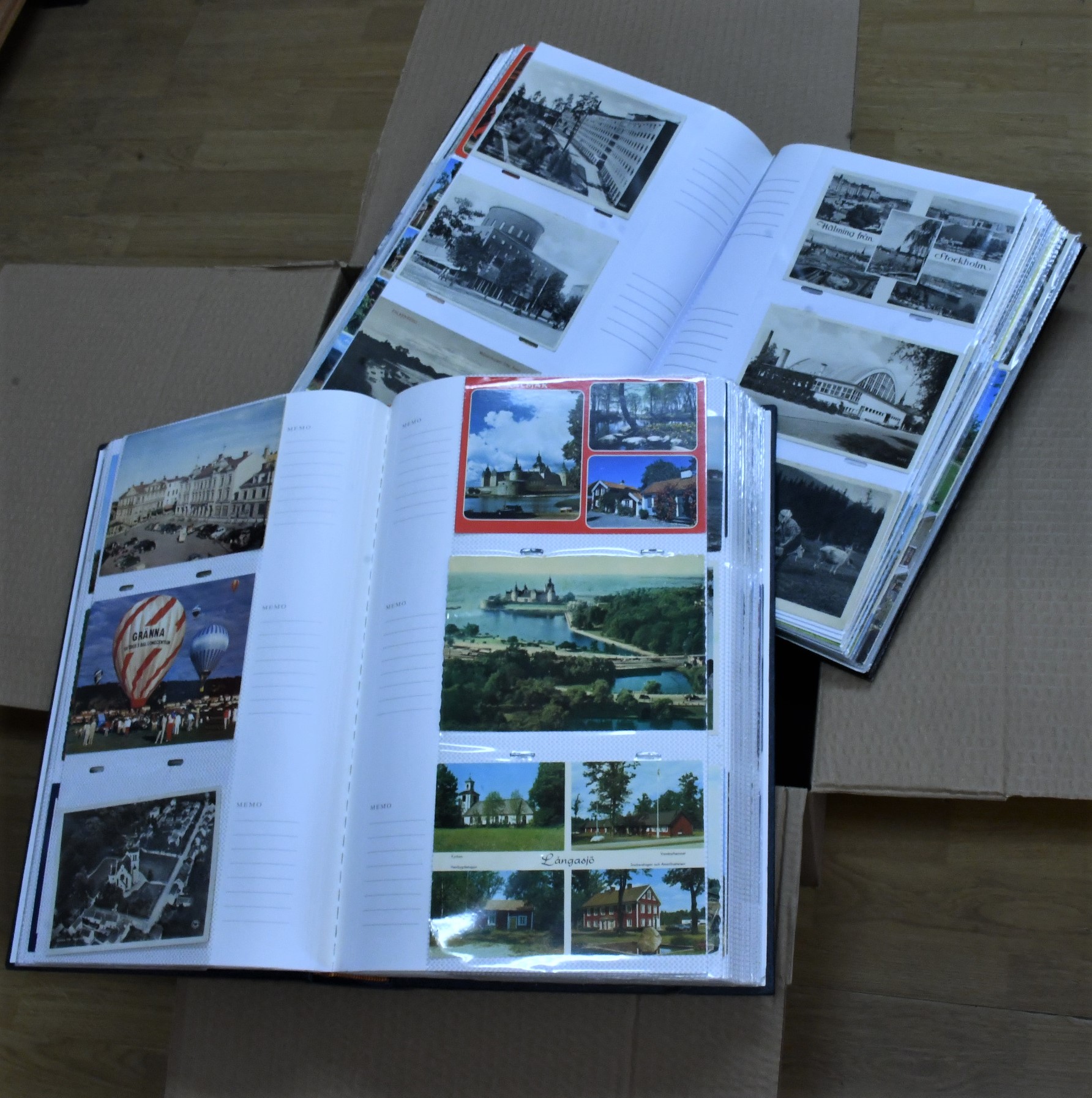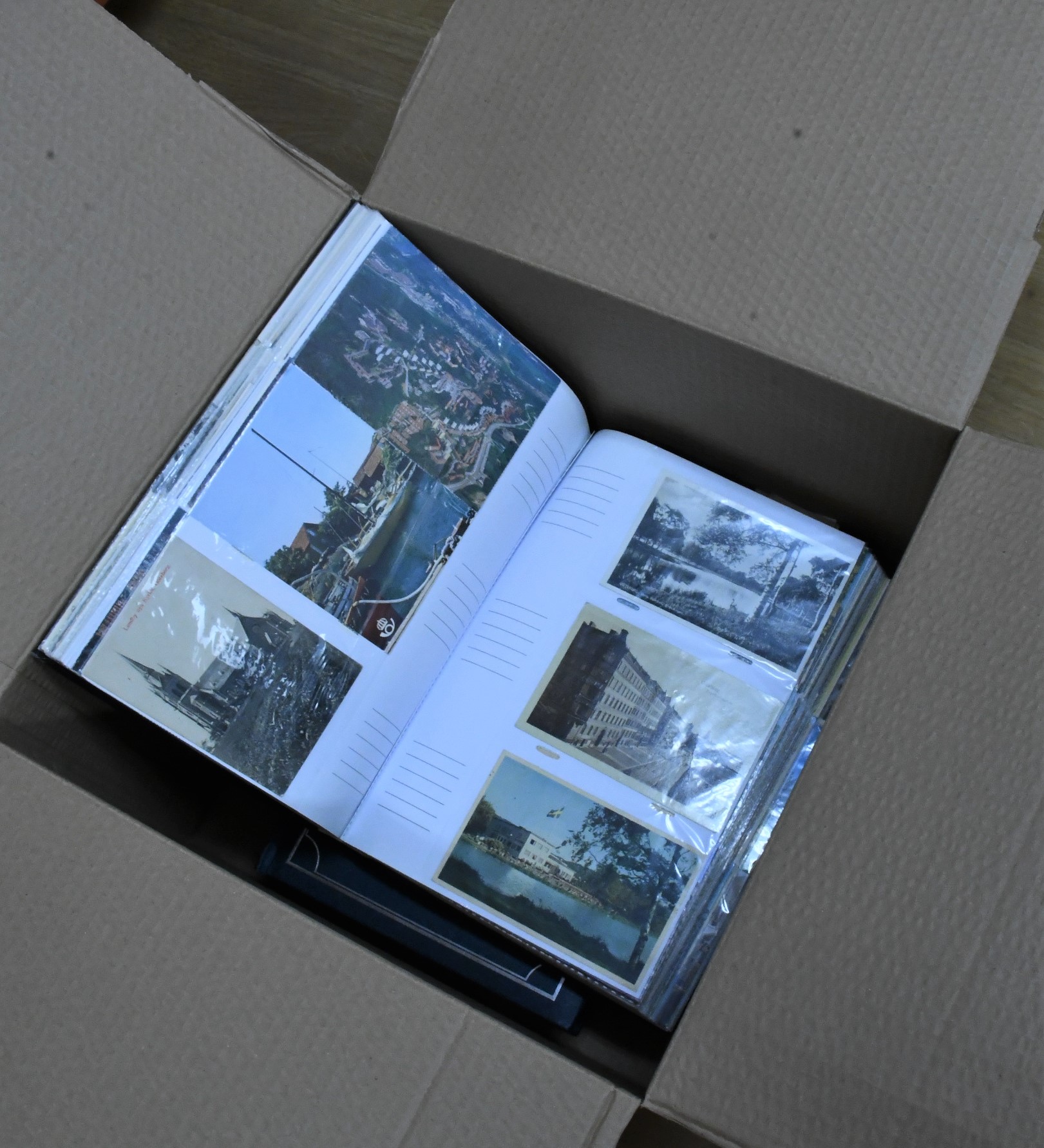 Sweden. Picture postcards, collection/accumulation 1940s–1990s. Topographical in two large photo albums, modern cards in vast majority. About six hundred in total, several related to Gothenburg. One binder with PORTOKORT (e.g. a collection "BingoBerra") and one binder with more Gothenburg-related material, e.g. the 1923 exhibition. A selection of scans are presented at www.philea.se. Approx. 9 kg. (approx 800)