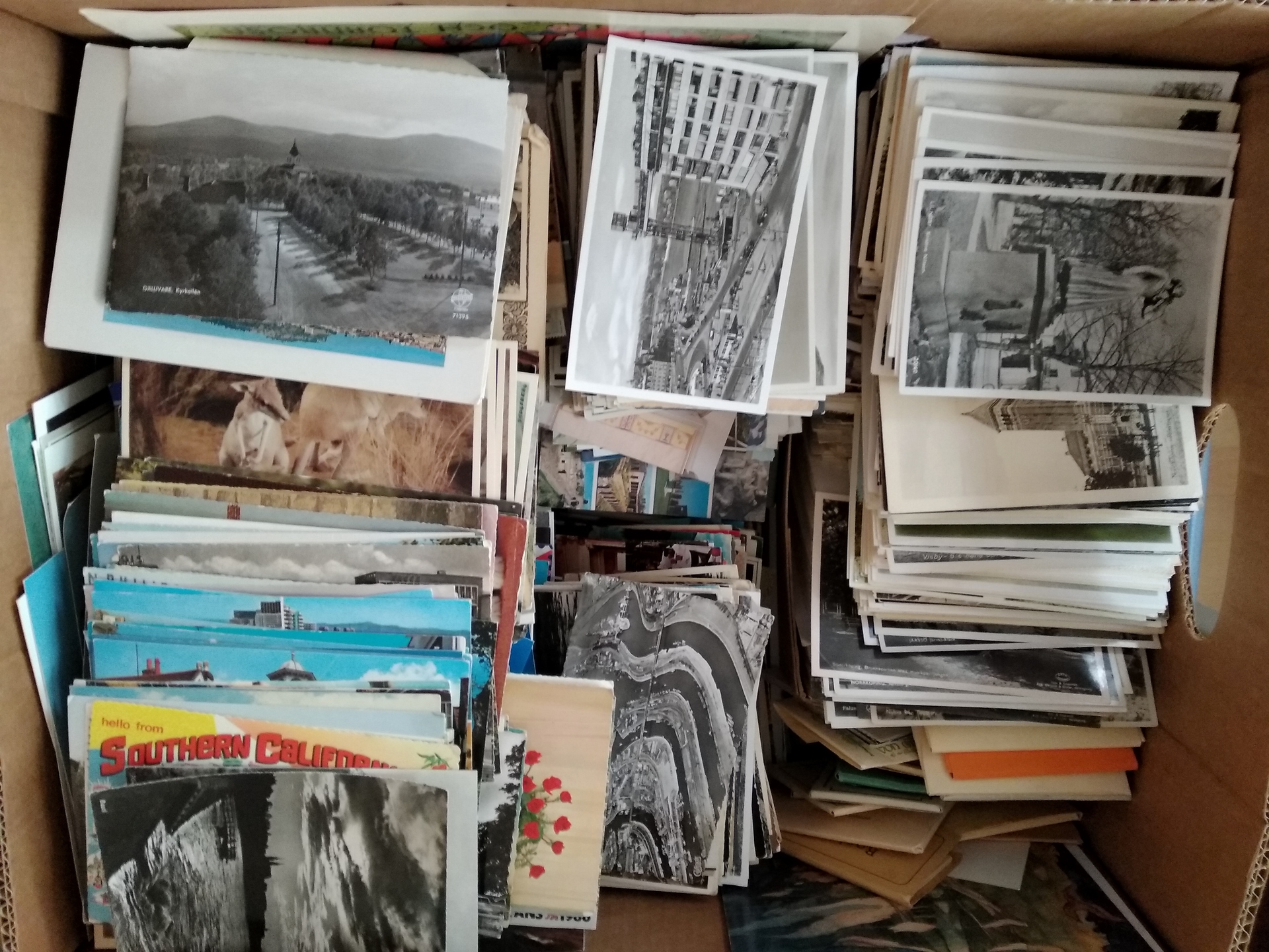 Sweden. Picture postcards, accumulation in banana box. Mostly modern topo Sweden and foreign, Sweden 300–400 cards between 1920–50, mixed in 3 albums. Good quality. Approx. 19 kg.