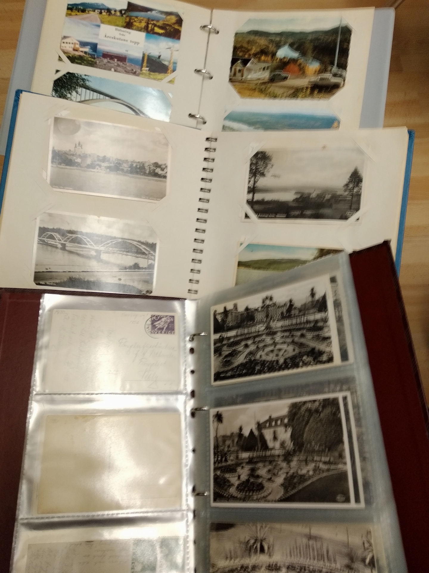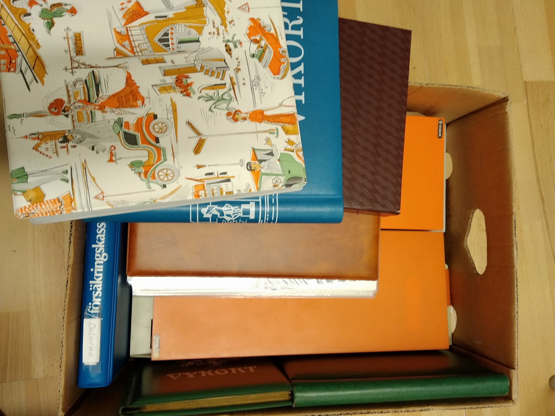 Sweden. Picture postcards, accumulation in banana box. Sweden topo (mostly), in seven albums and two boxes, semi-modern–modern, mainly A6. Approx. 16 kg. (approx 1500)