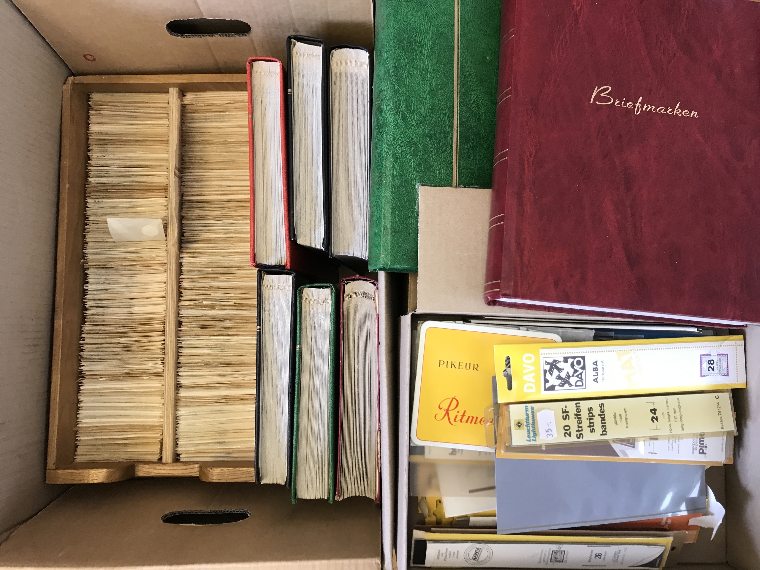 Sweden. Used. Big stock Circle types–2016 sorted in envelopes + eight thick stockbooks. Also some empty albums and stamp mounts DAVO and Hawid, etc. Approx. 29 kg.