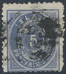 Iceland. Facit 23 used, 1876 Aur values 5 aur blue-grey, rough perf 12¾. Short corner and with heavy cancel. SEK 6500