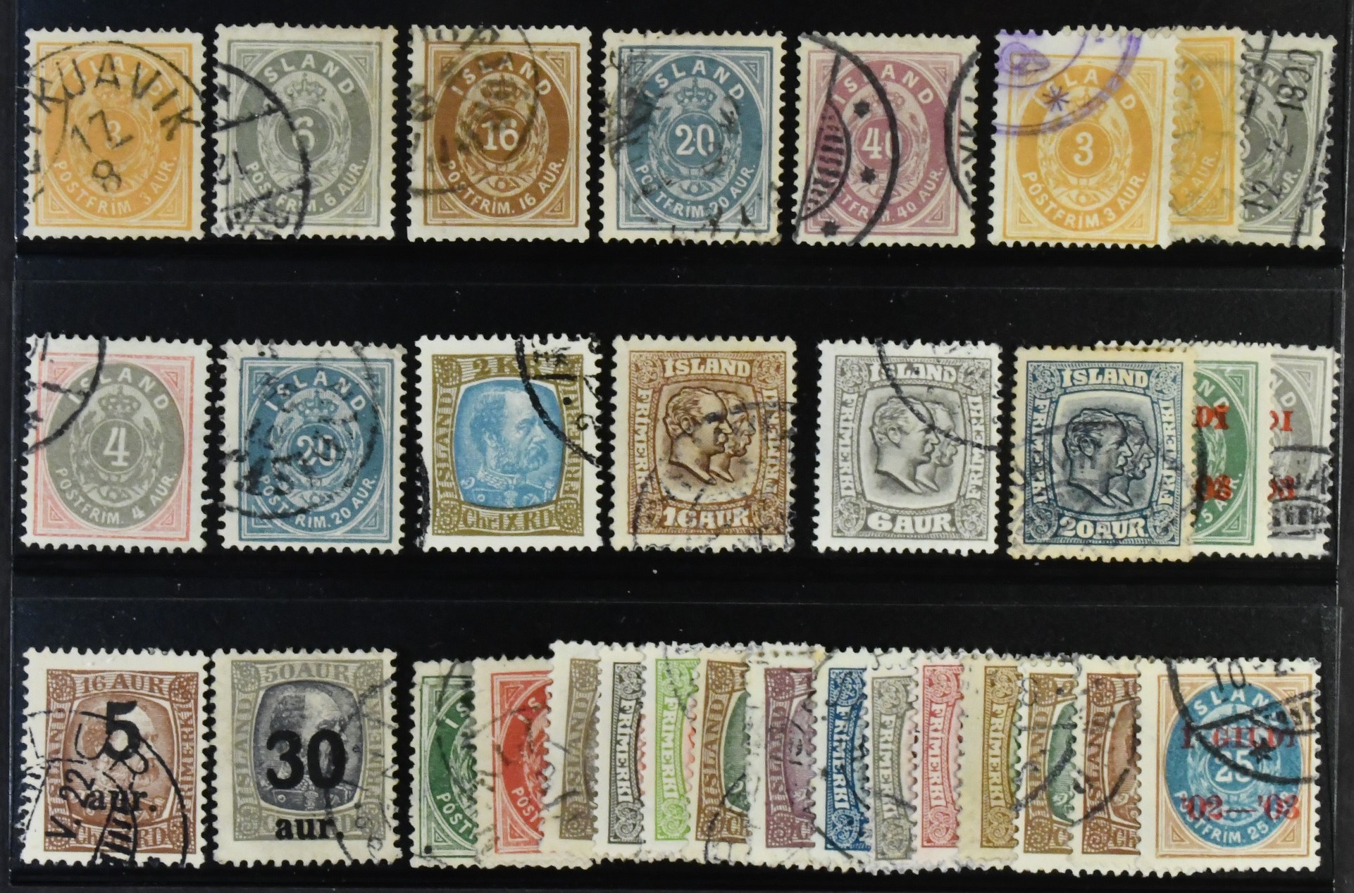 Iceland. Used 1876–1929. All different, e.g. F 8, 11, 13, 15, 1721-22, 28, 74, 83, 95, 97, 98, 101. Mostly good quality. F SEK 7130 (32)
