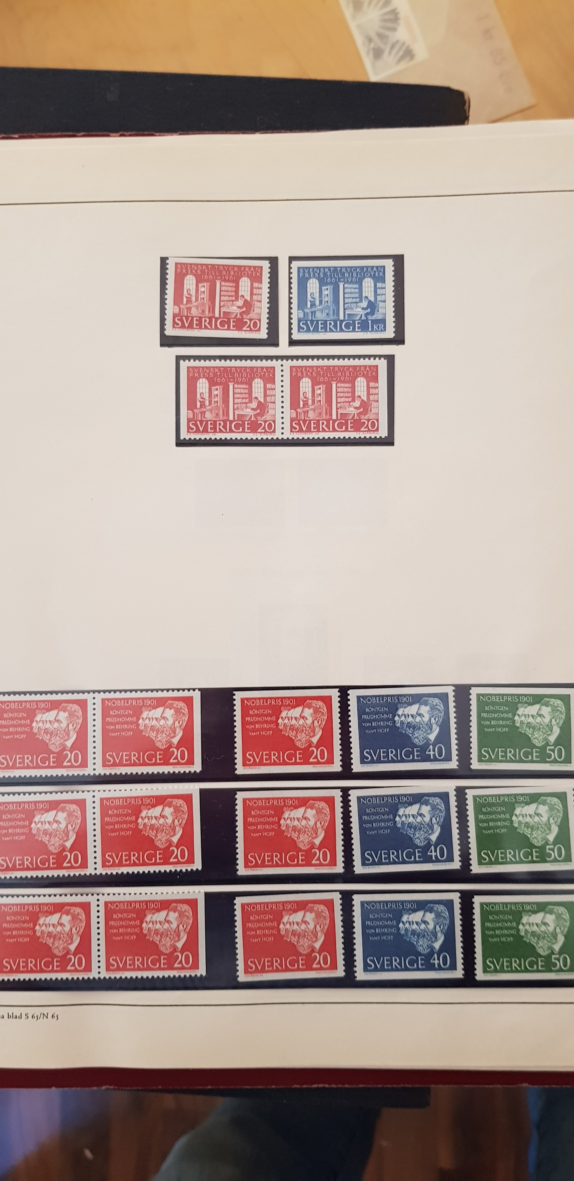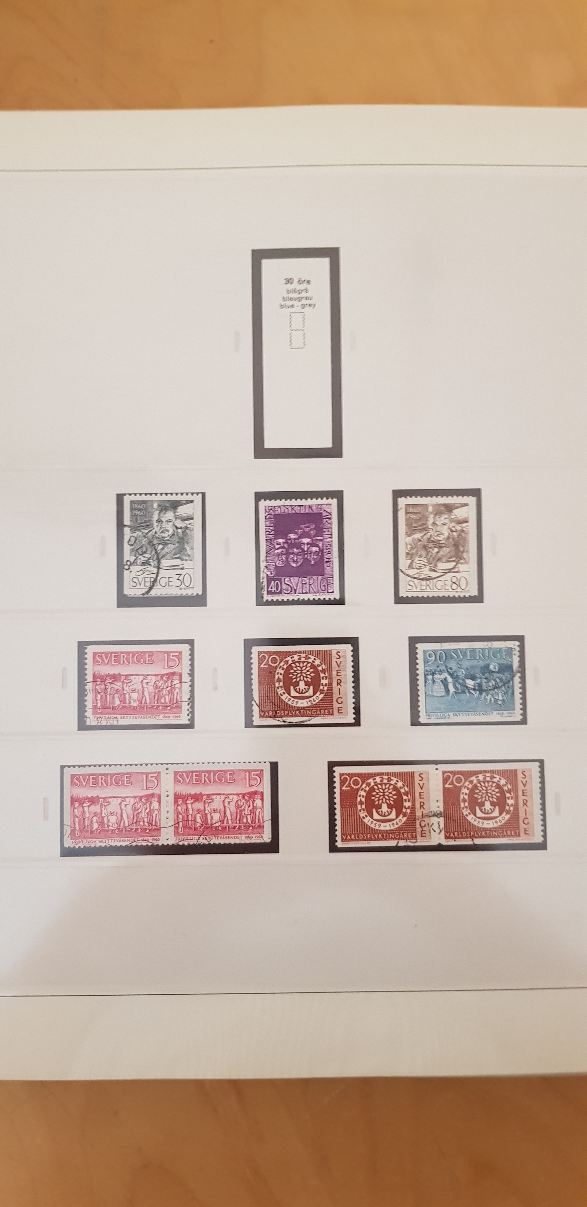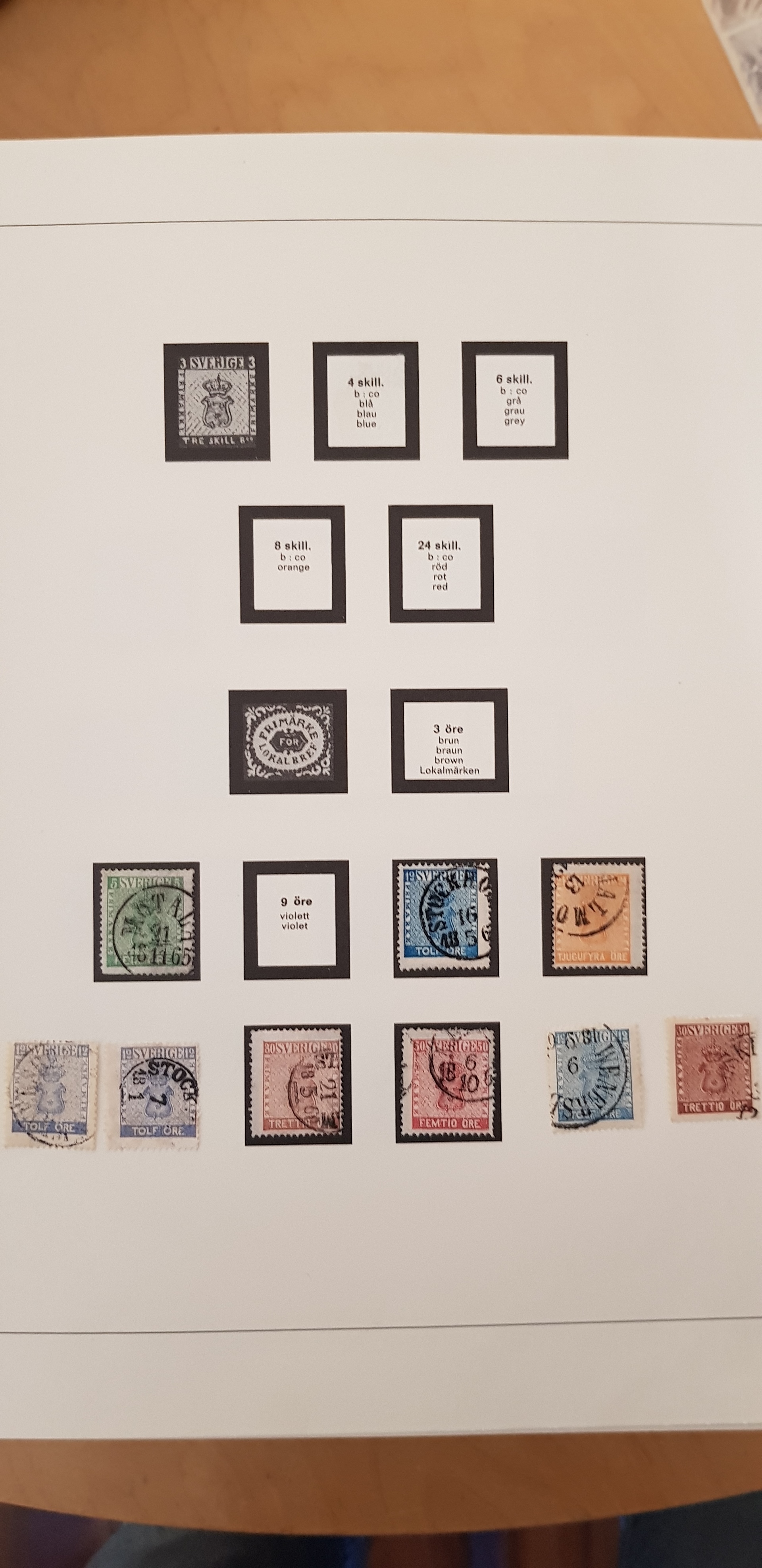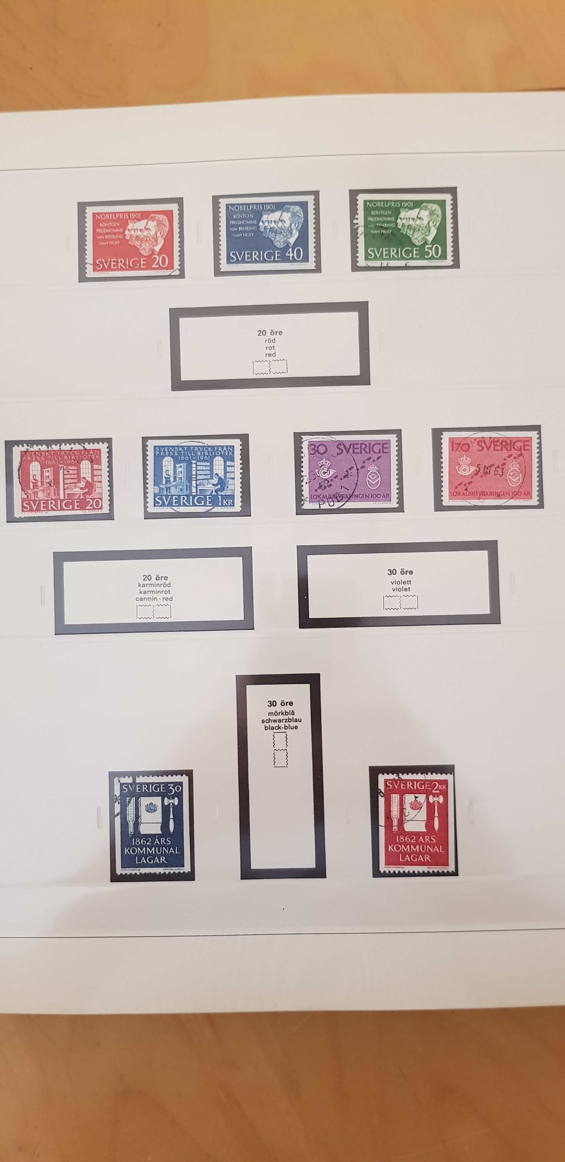 Sweden. Collection mostly used 1855–1974 in box. Five albums – one Gripen 1855-1963, one Davo album 1855-1969, one Safe album 1855-1969, a Facit album 1855-1974 and finally a Safe dual album 1962-1974. With both used and unused stamps. Low reserve. Mostly fine quality. Approx. 10 kg.
