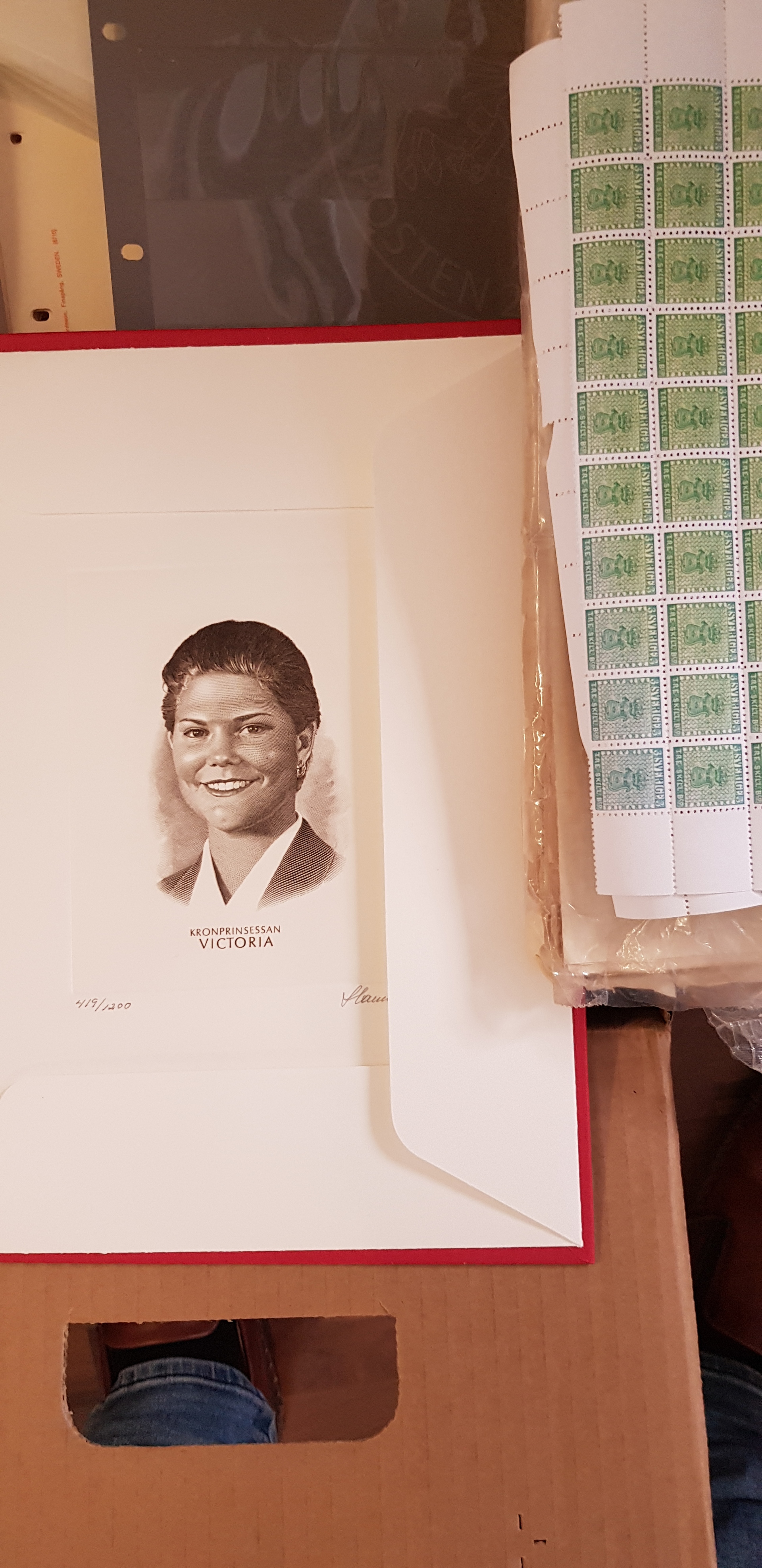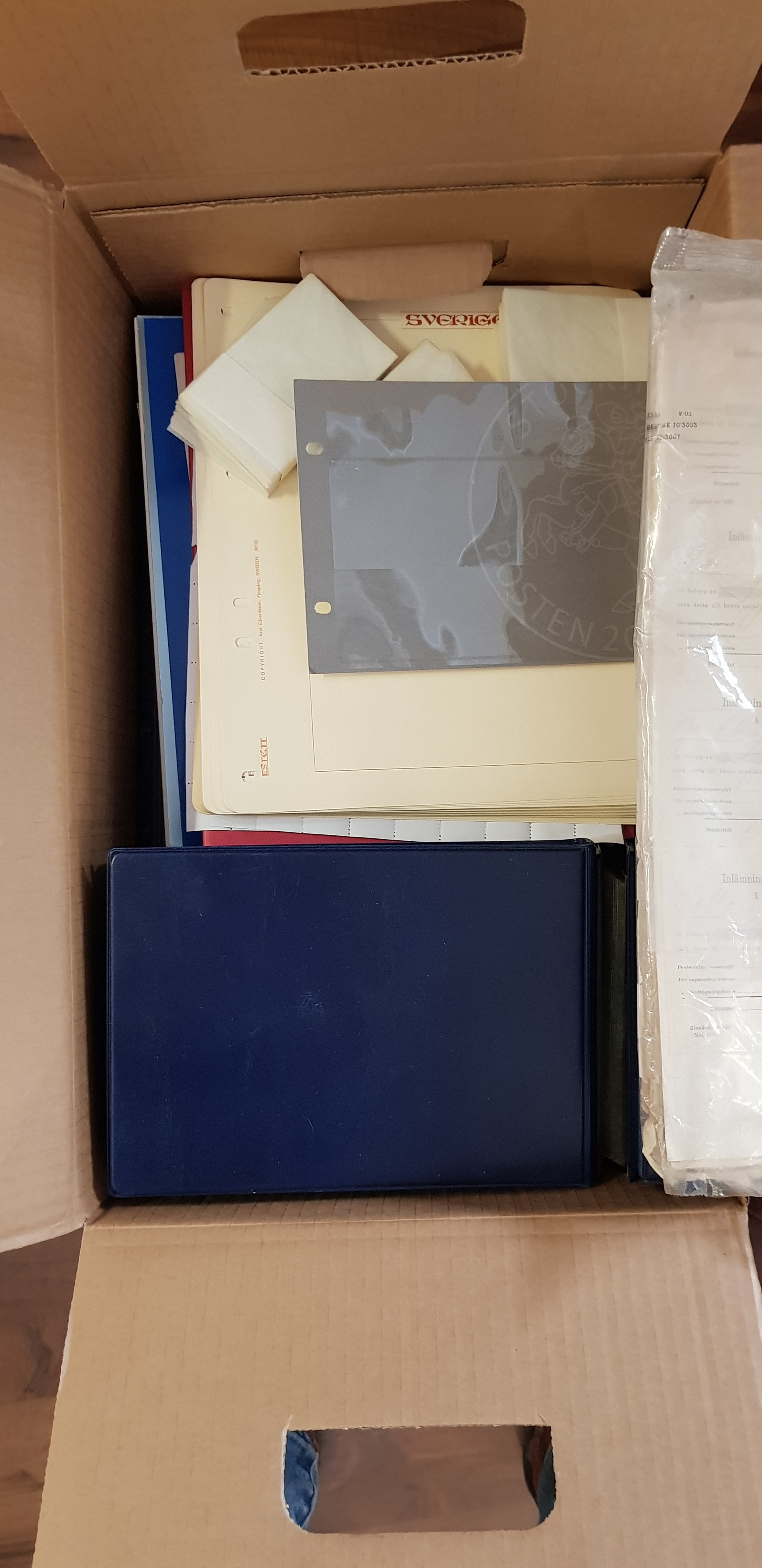 Sweden. Miscellaneous, accumulation 1900s in box. In this box you will find a portrait of the princess Victoria, twelve FDC albums, a historical story of the Oscar Fredriks fortress in Vaxholm and a lot more of albums, pages for albums and other items. Mostly fine quality. Approx. 14 kg.