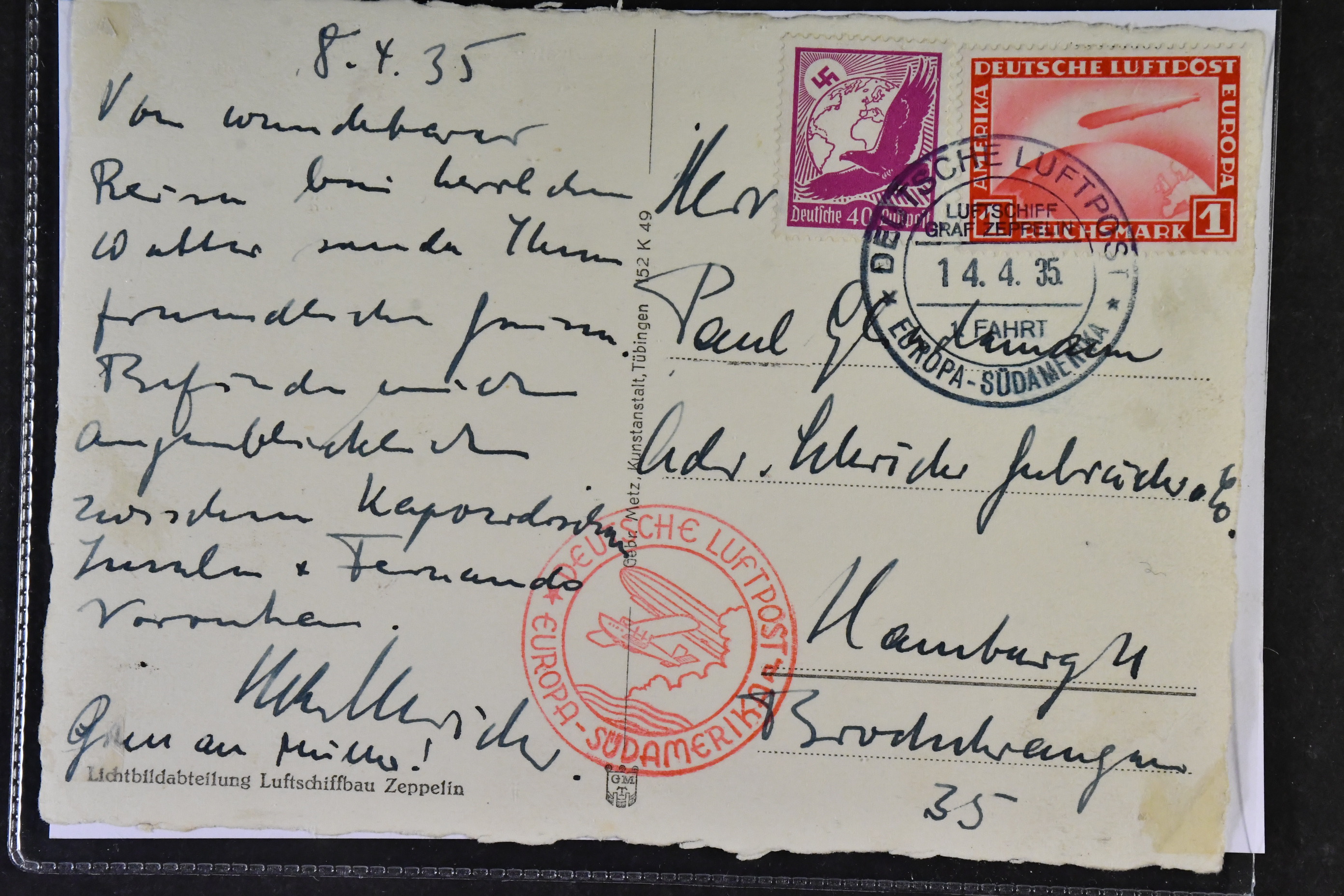 Germany, Reich. Michel 455 or Scott C35 ★, Inland card franked with Graf Zeppelin 1 RM red and 40 pf stamp. Tied by DEUTSCH LUFTPOST EUROPA – SÜDAMERIKA 1 FART 14.4.35.