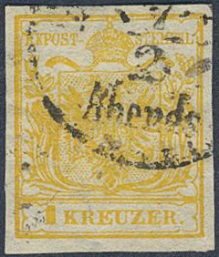 Austria. Michel 1x used, 1850 Coat-of-arms 1 Kr yellow wmk 1. EUR 150