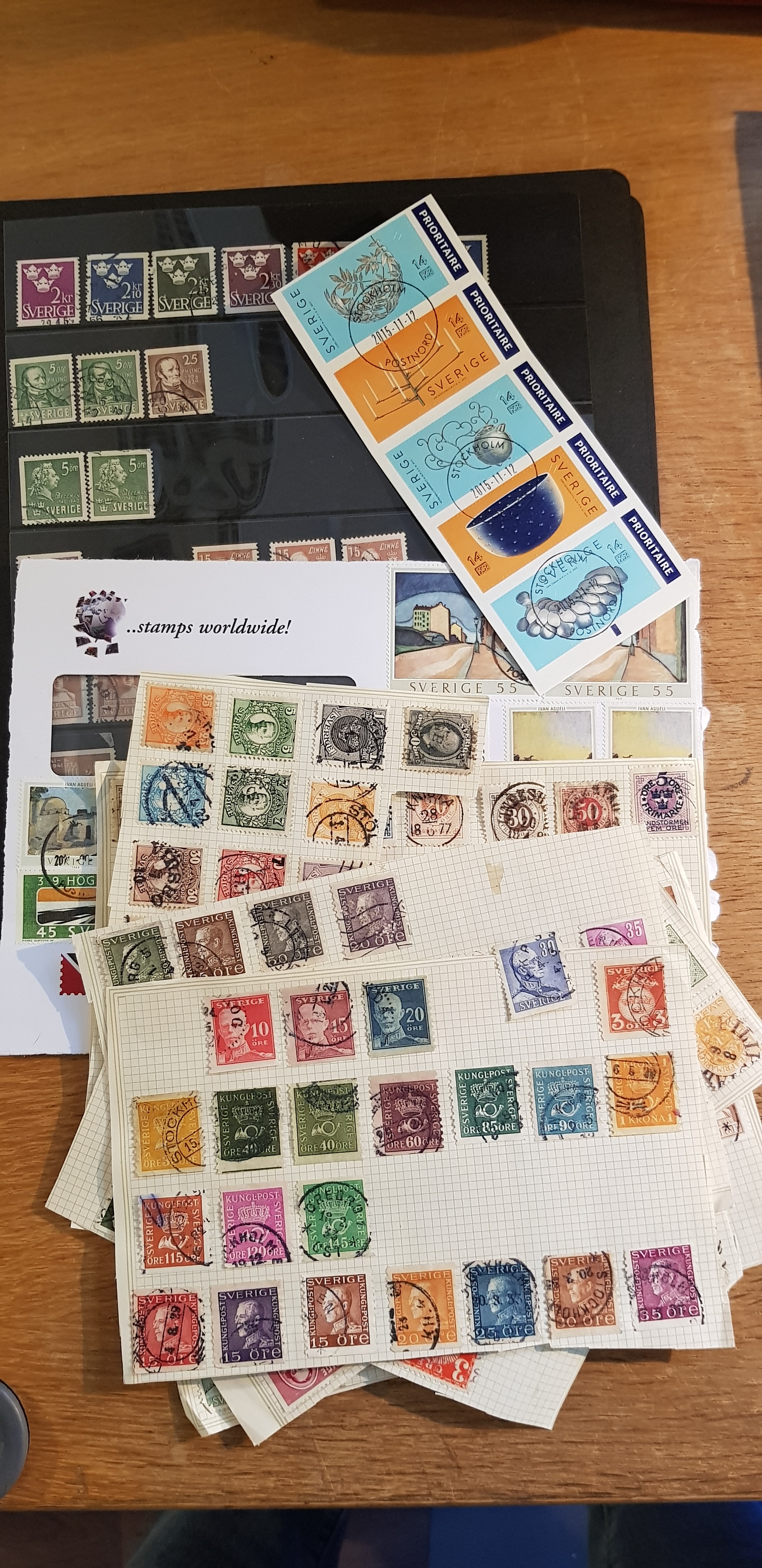 Sweden. Collection/accumulation mostly used 1855–2015 in box. One Facit album 1855-1954 well equipped with 3+4 and 4+3 and the Universal Postal Congress. A stockbook with duplicates. One Visir album with stamps in it. An album from 1855-1979 not so well equipped. Please see a selection of scans at www.philea.se. Good quality. Approx. 6 kg. (>5000)