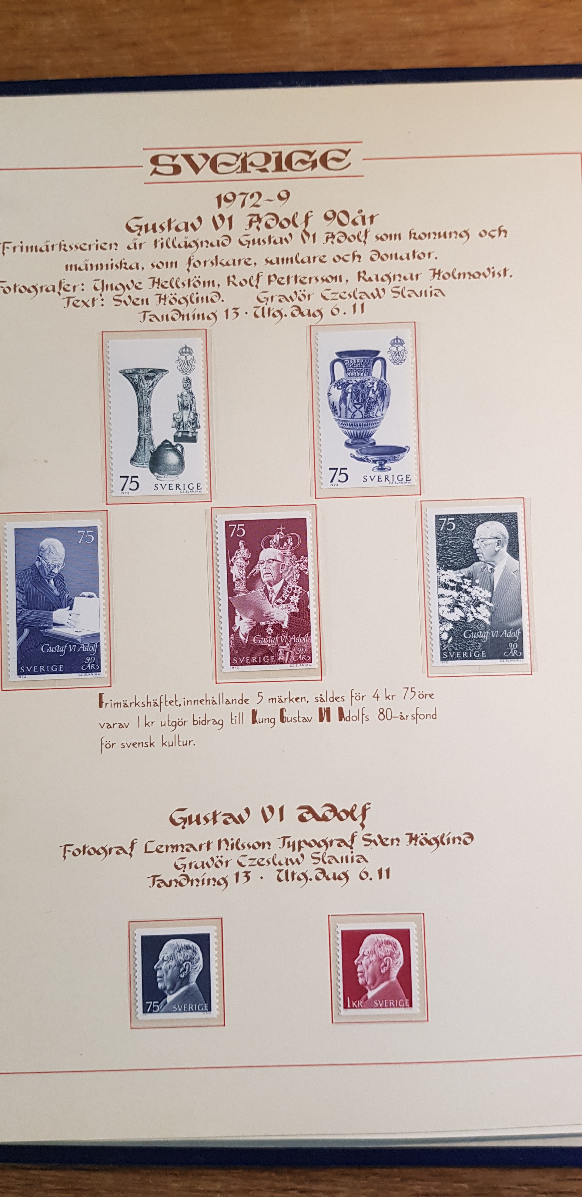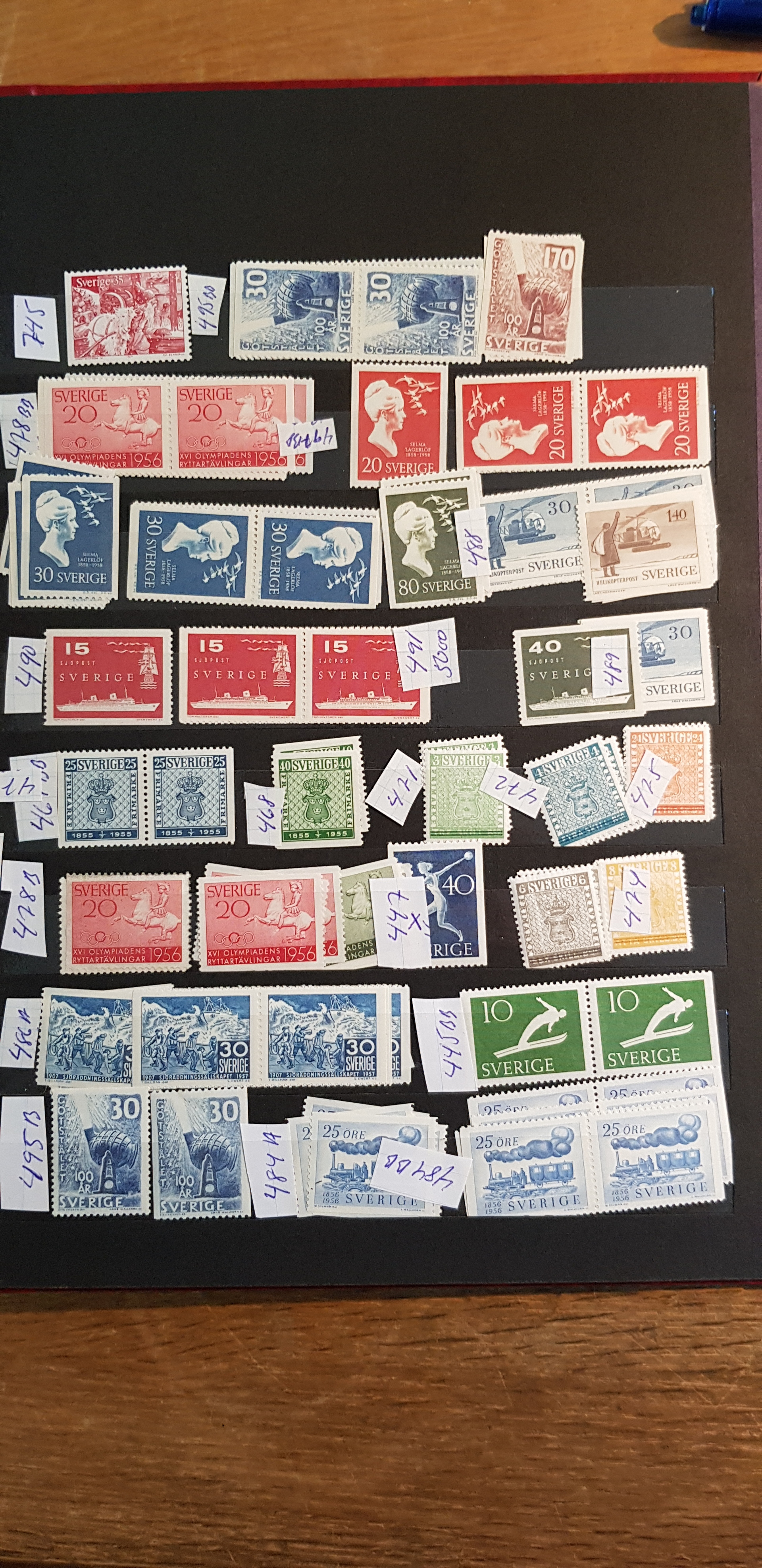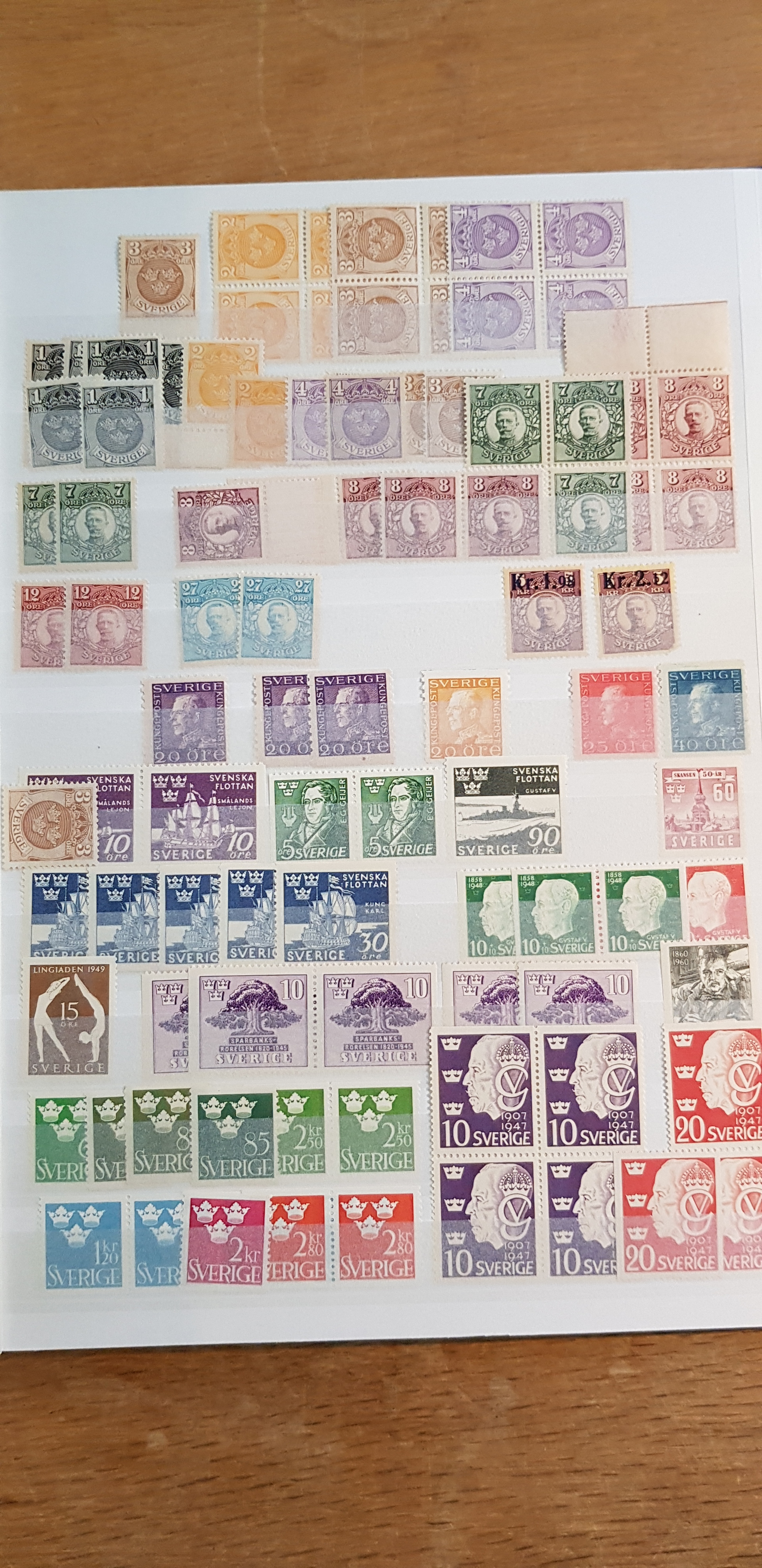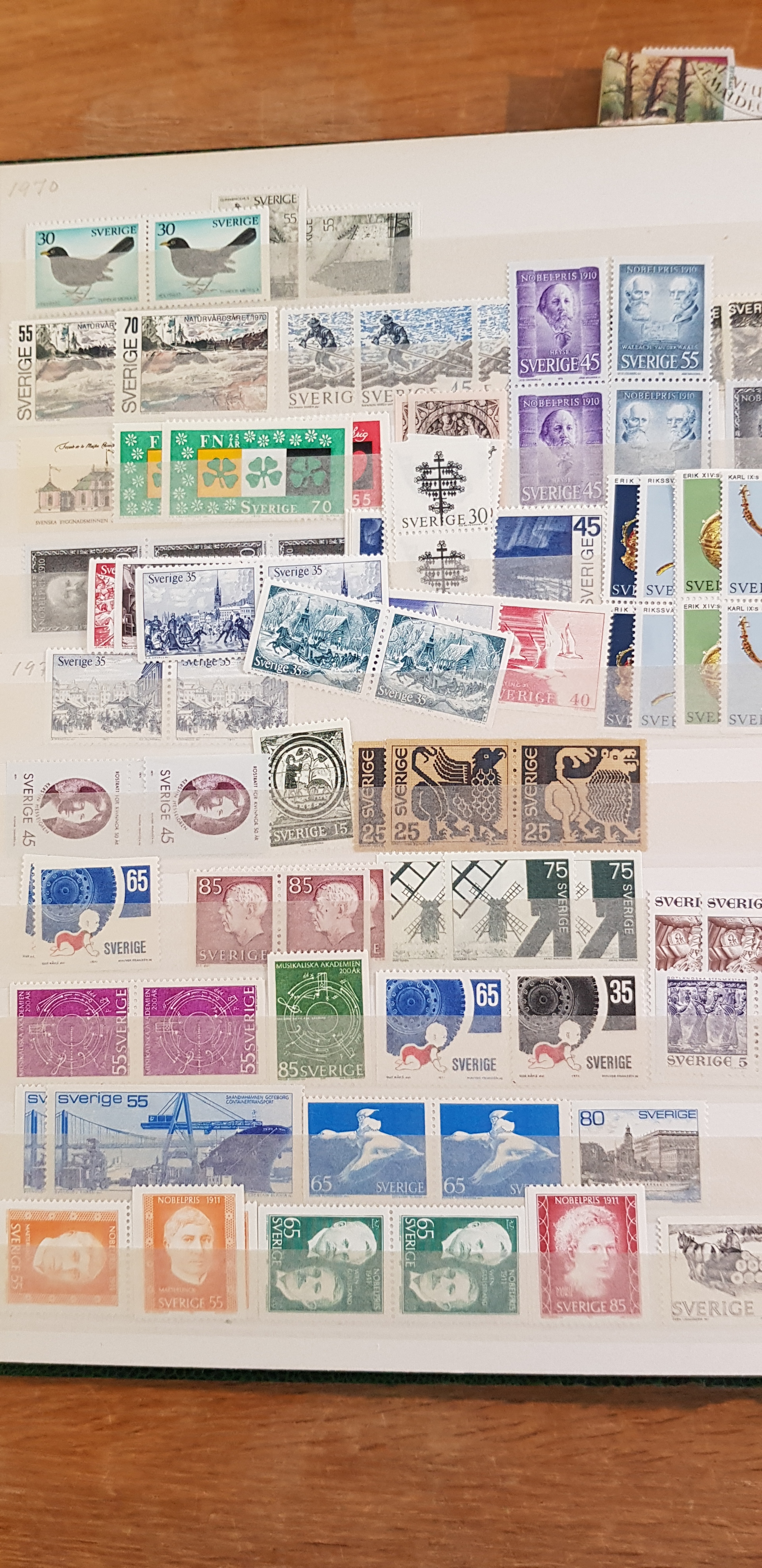 Sweden. Collection/accumulation mostly ★★ 1900s in box. Estett album with unused stamps from 1968-1975 almost complete. One Visir album with leaves from 1975-1985 also almost complete. A nice Facit album from 1969-1975 with all unused stamps. A Leuchtturm album from 1938-1975. Six stockbooks with mostly unused stamps in varied quality. Please see a selection of scans at www.philea.se. Good quality. Approx. 14 kg. (>3000)