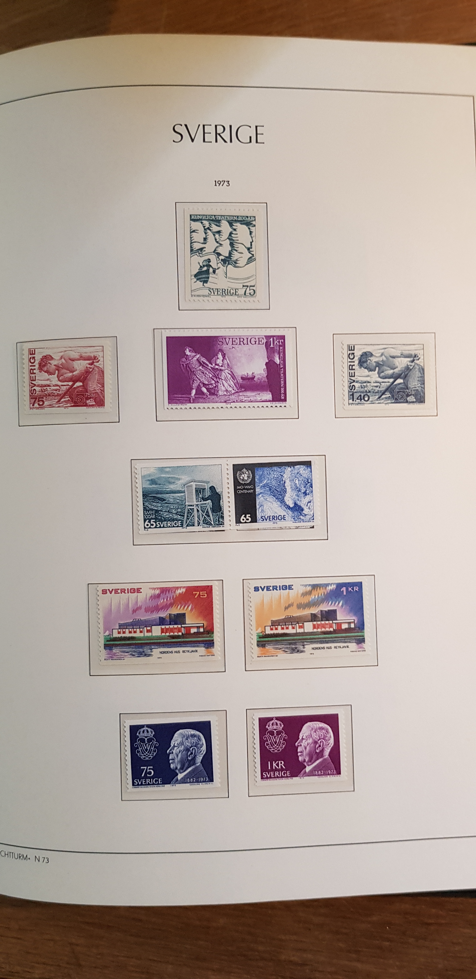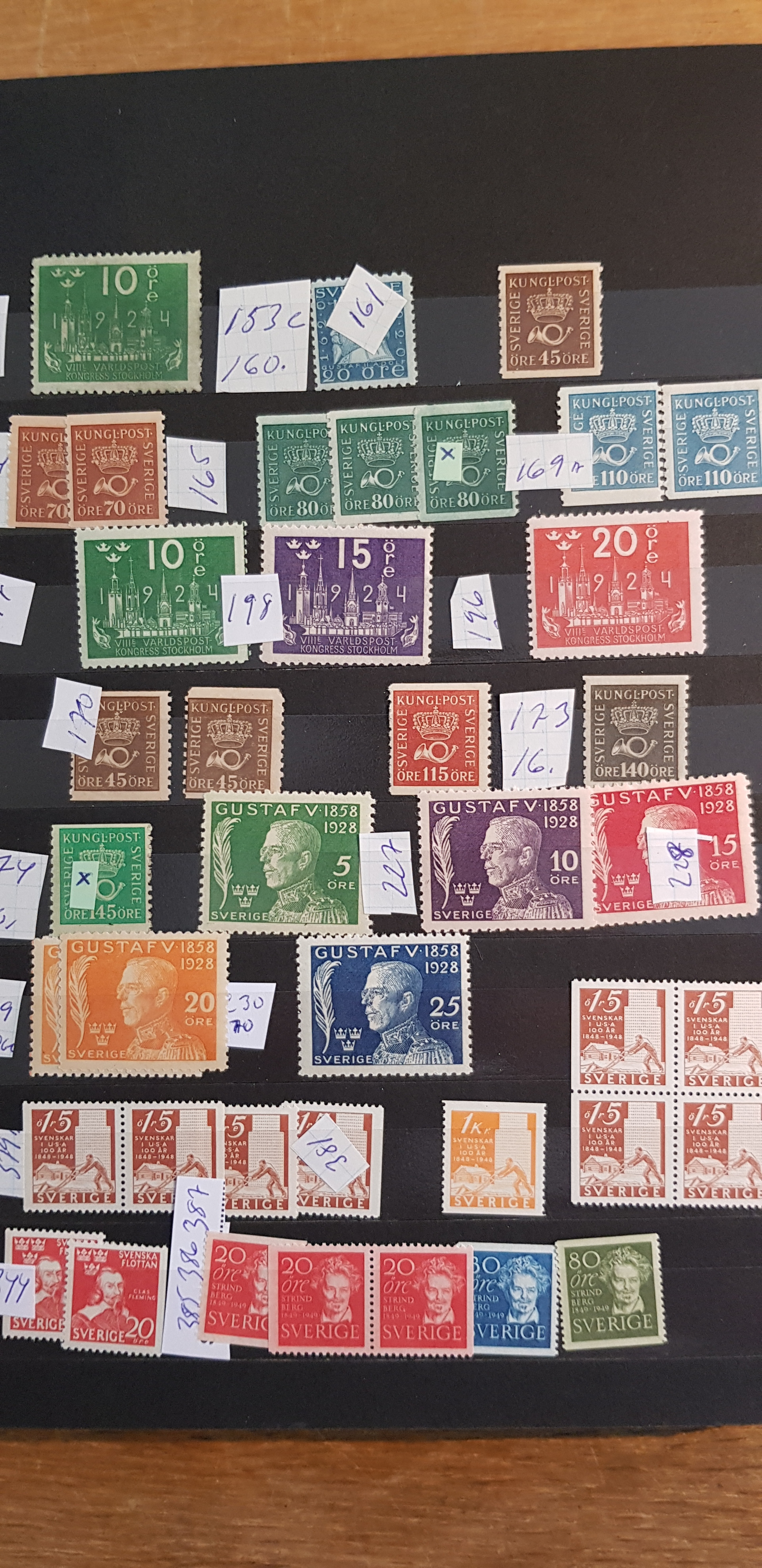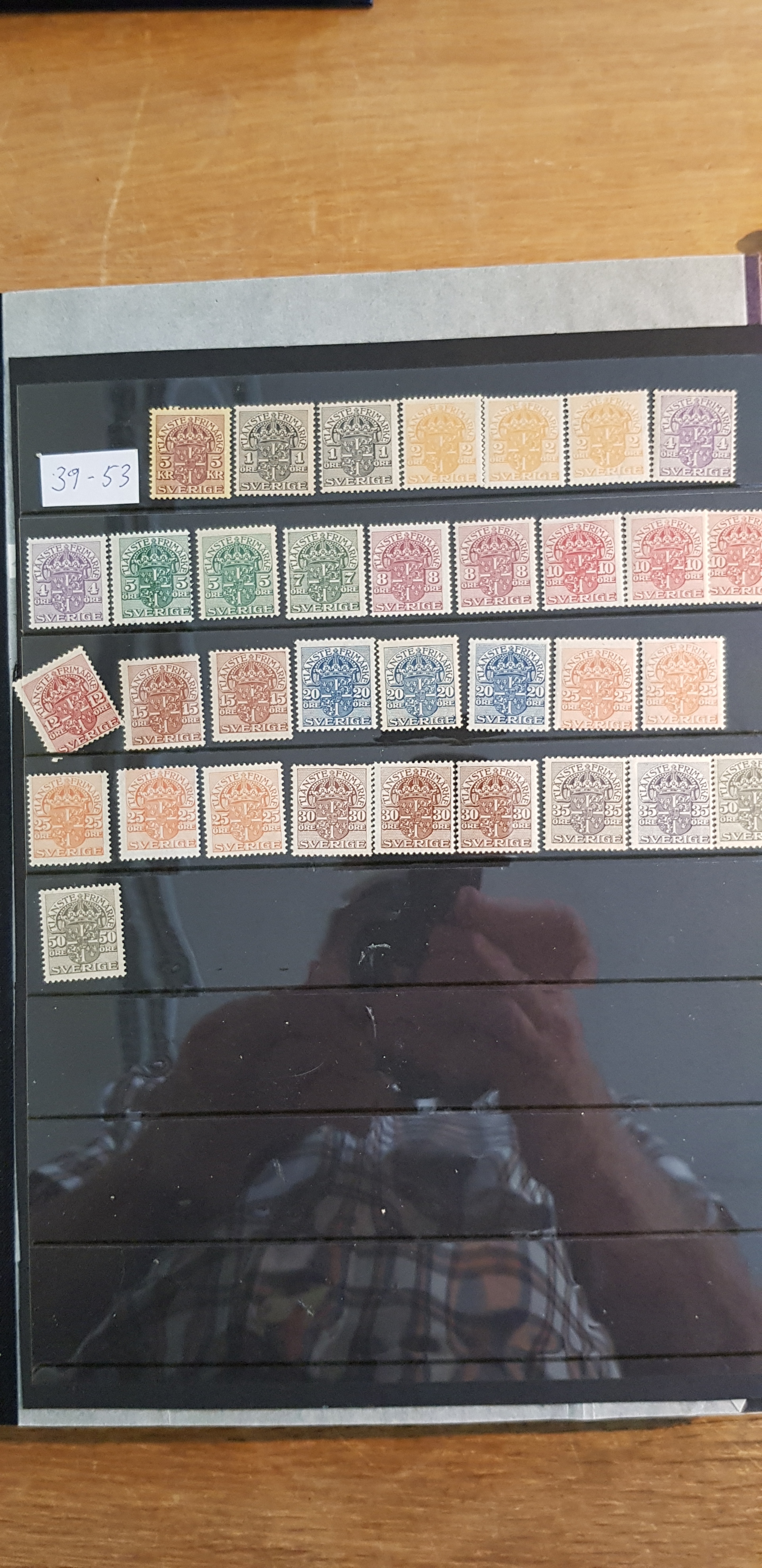 Sweden. Collection/accumulation mostly ★★ 1900s in box. Estett album with unused stamps from 1968-1975 almost complete. One Visir album with leaves from 1975-1985 also almost complete. A nice Facit album from 1969-1975 with all unused stamps. A Leuchtturm album from 1938-1975. Six stockbooks with mostly unused stamps in varied quality. Please see a selection of scans at www.philea.se. Good quality. Approx. 14 kg. (>3000)