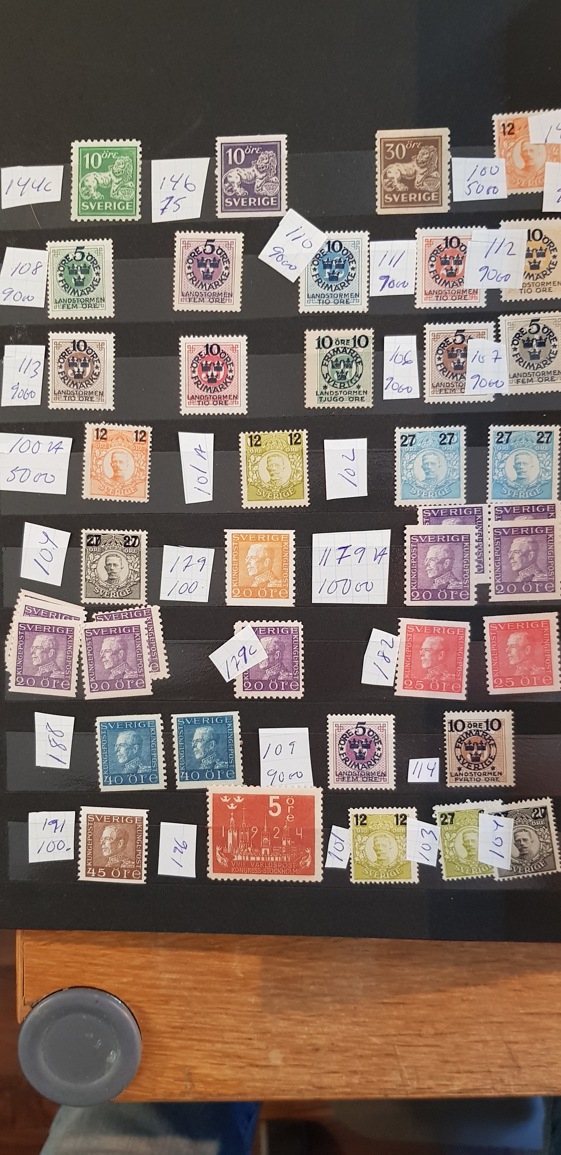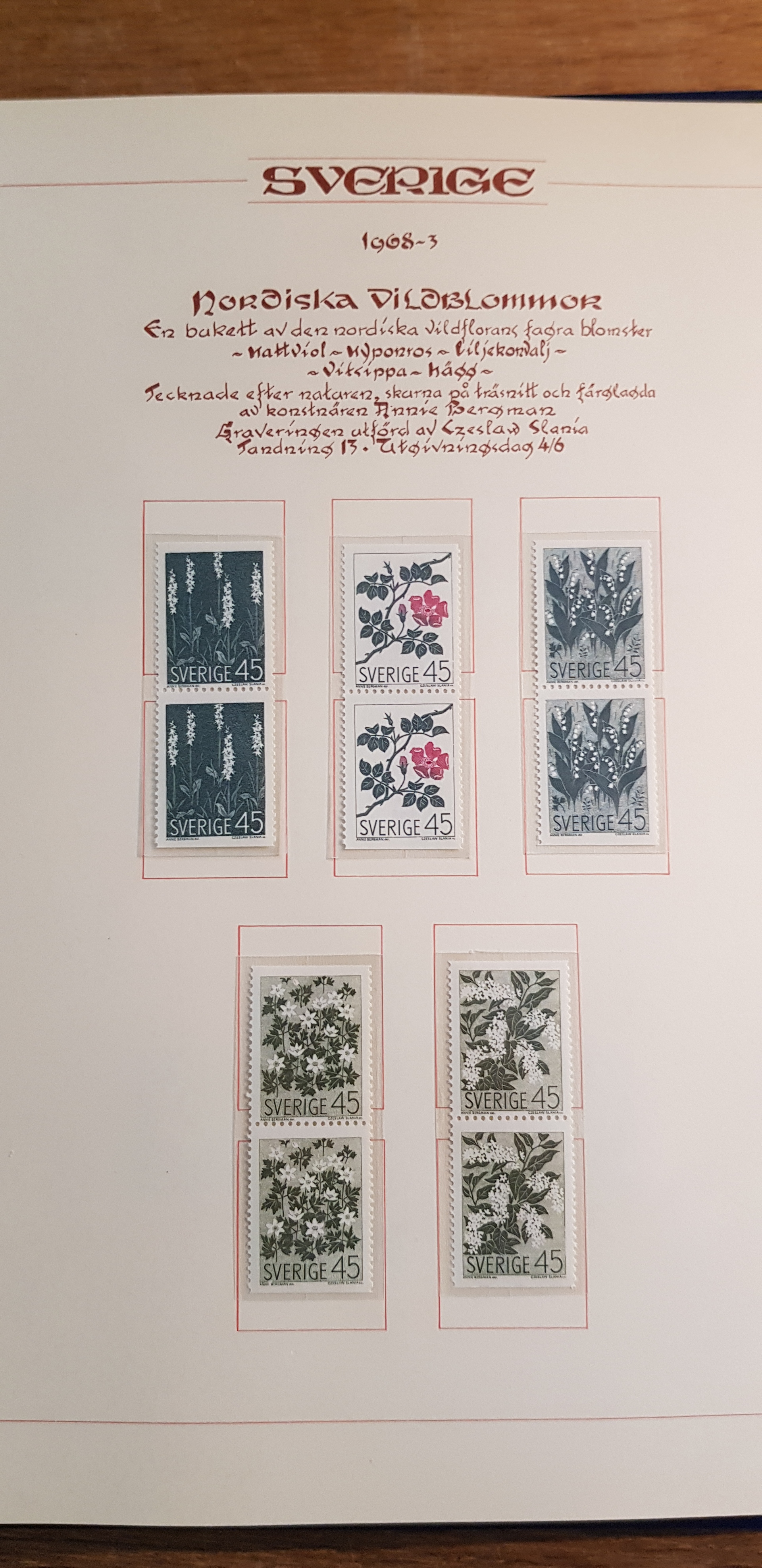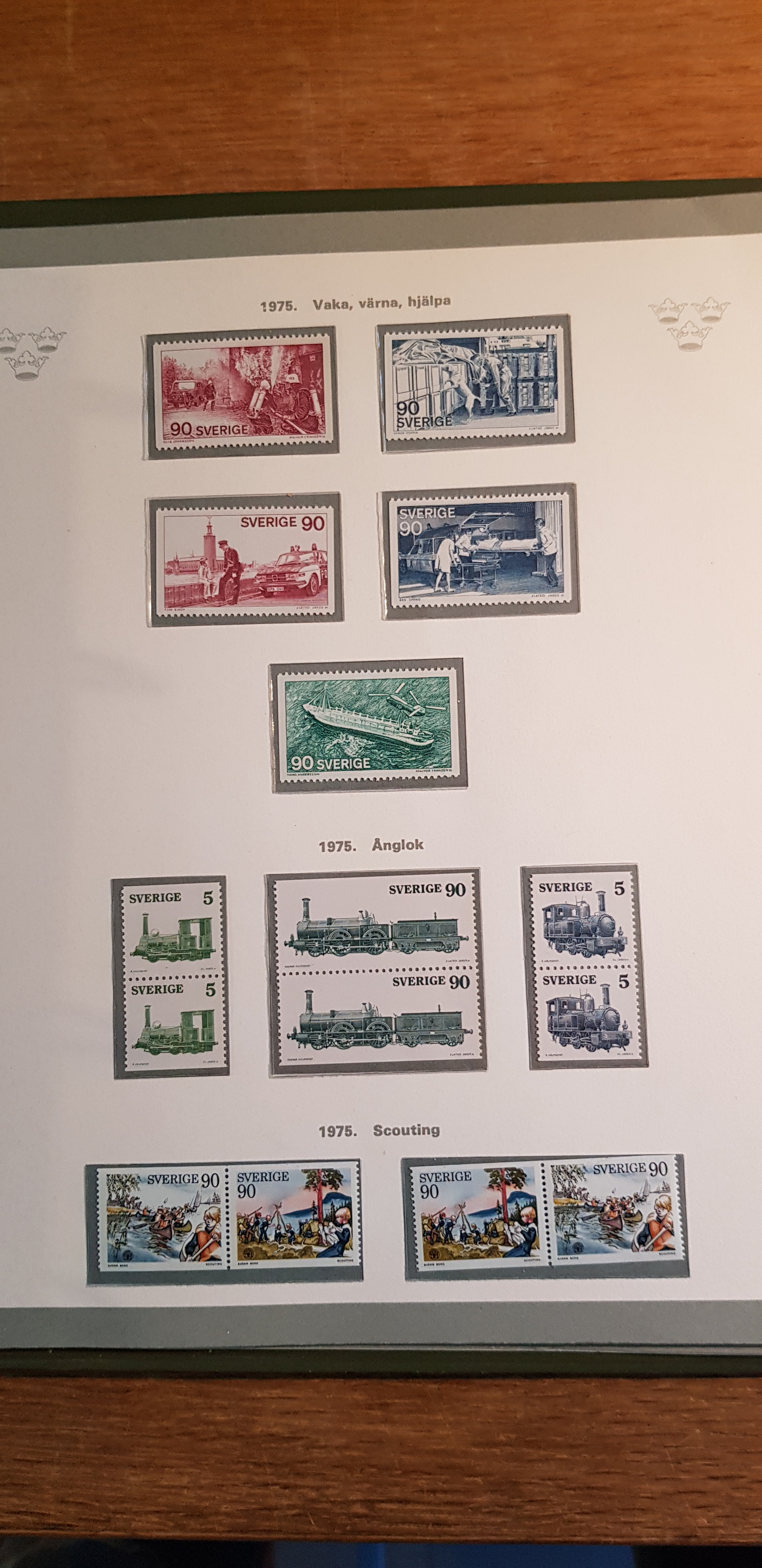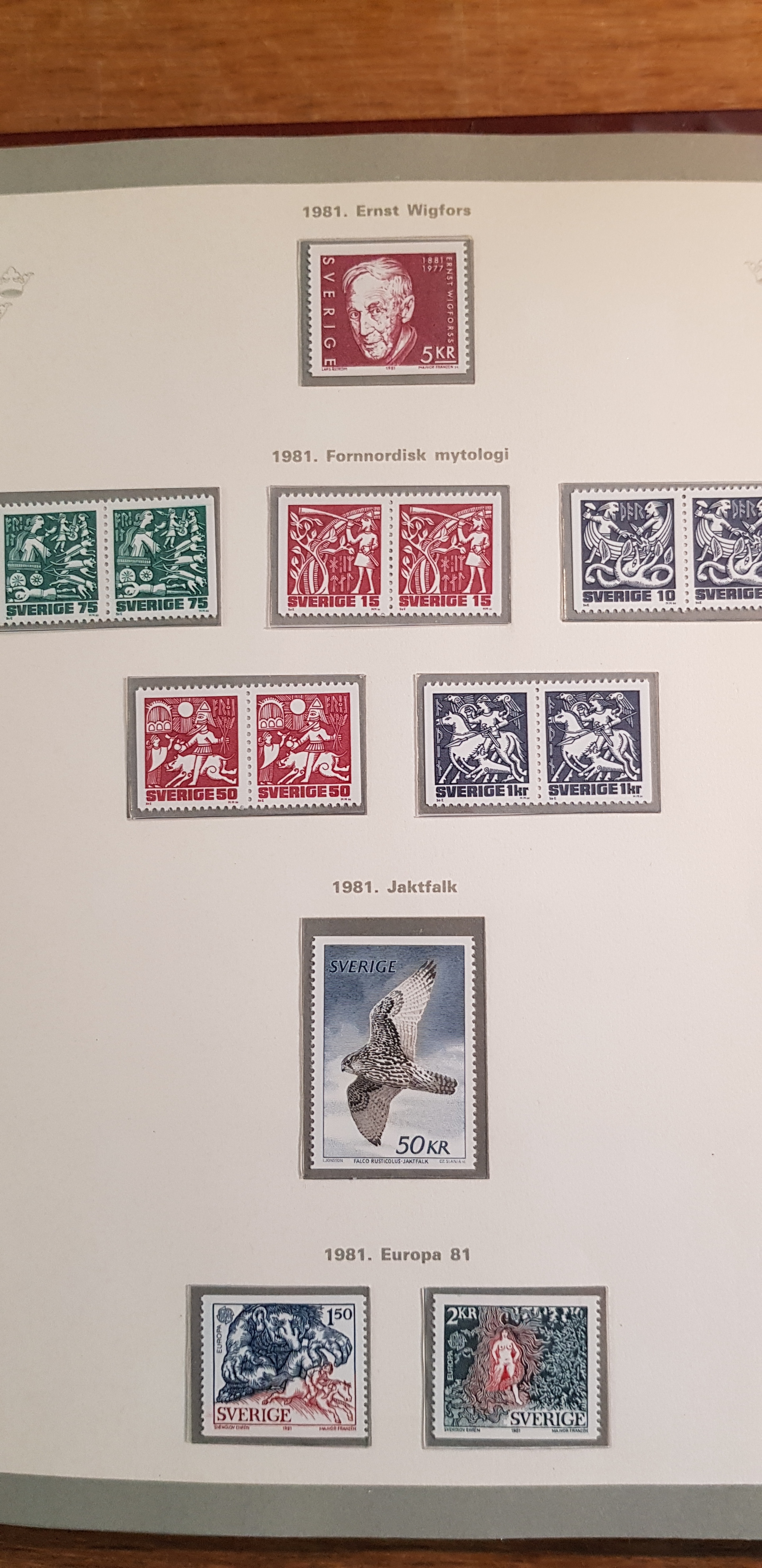 Sweden. Collection/accumulation mostly ★★ 1900s in box. Estett album with unused stamps from 1968-1975 almost complete. One Visir album with leaves from 1975-1985 also almost complete. A nice Facit album from 1969-1975 with all unused stamps. A Leuchtturm album from 1938-1975. Six stockbooks with mostly unused stamps in varied quality. Please see a selection of scans at www.philea.se. Good quality. Approx. 14 kg. (>3000)