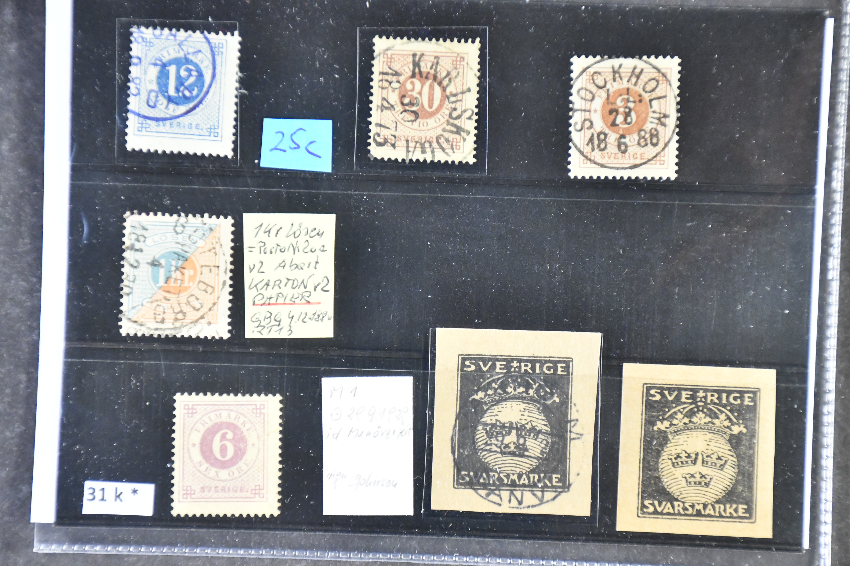 Sweden. Lot ★/⊙ 1870s–1920s on stock card. E.g. F25c, 32 cancelled GÄLLARYD in violet colour (R5 according to SSPD), L20v2 (carton paper) and M1 in two copies (incl. one used). Please inspect. Somewhat mixed quality. (7)
