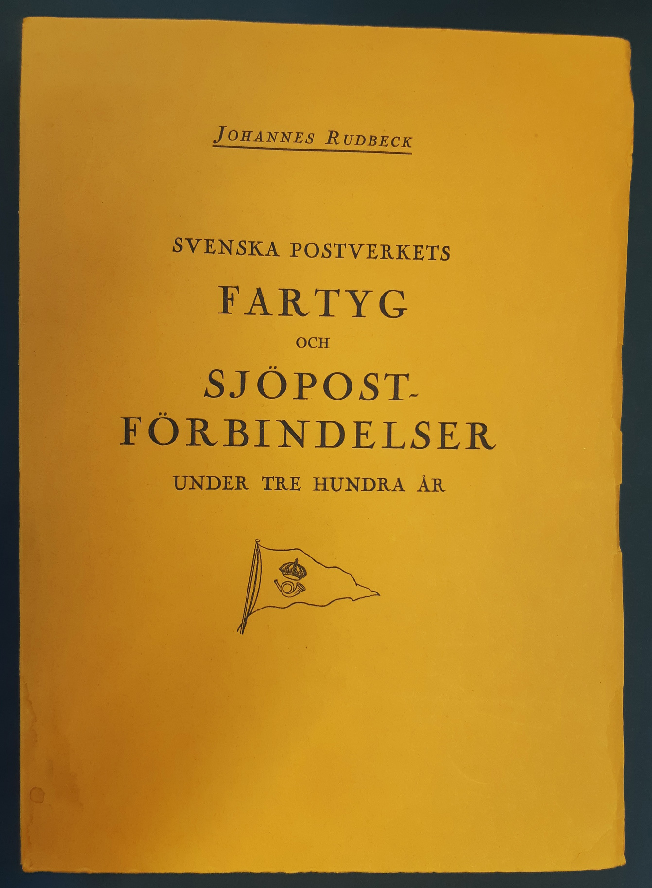 Literature. Maritime mail. "Svenska postverkets fartyg och sjöpostförbindelser under 300 år" (J. Rudbeck, 1933), 437 pp., soft bound. Used, with small moisture stain on spine. Sought-after and useful.