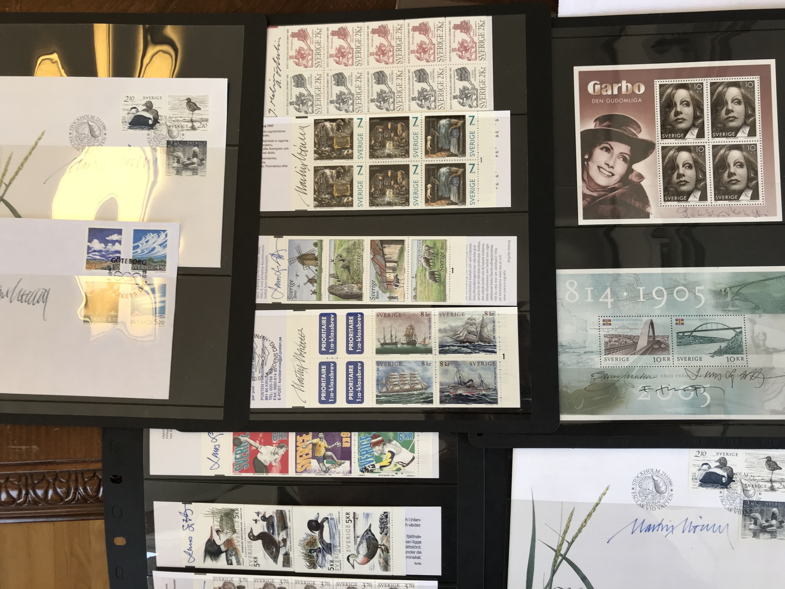 Autographs. 19 booklets and souvenir sheets + nine covers/cards with engravers and cartoonists autographs. E.g. five Slania, also Mörck, Franzén, Naszarkowski and Sjöblom, souvenir sheet Garbo.