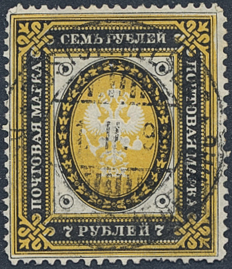 Finland. Facit 47 used, 1891 Russian types with rings 7 R black/yellow. Short perfs at bottom. SEK 2500
