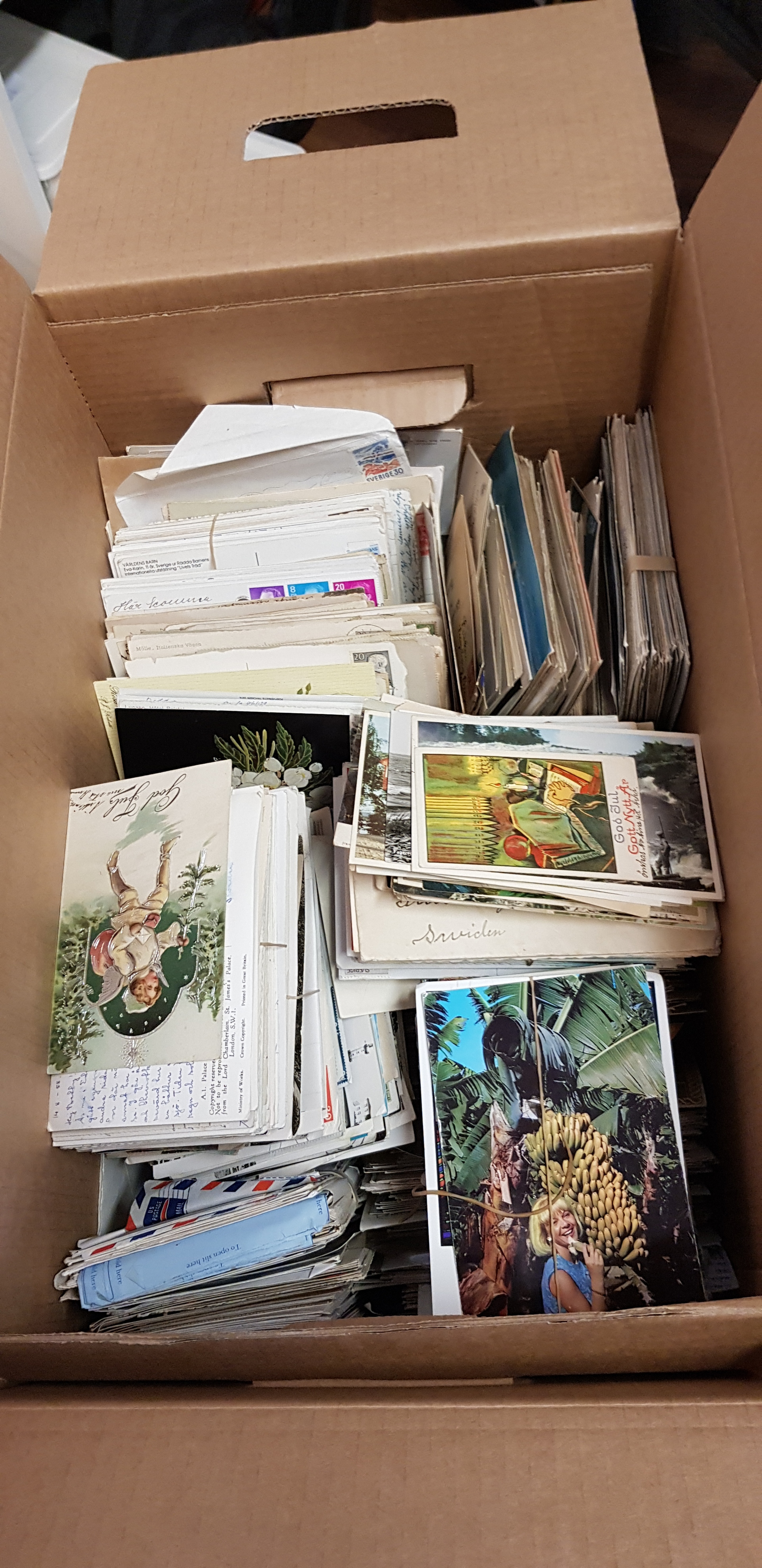 ALL WORLD. Picture postcards, accumulation 1800s–1900s in removal box. Tihis box contains of mostly postcards of a great variation. A chance to find what you are looking for. Please see a selection of scans at www.philea.se. Mostly fine quality. Approx. 12 kg.