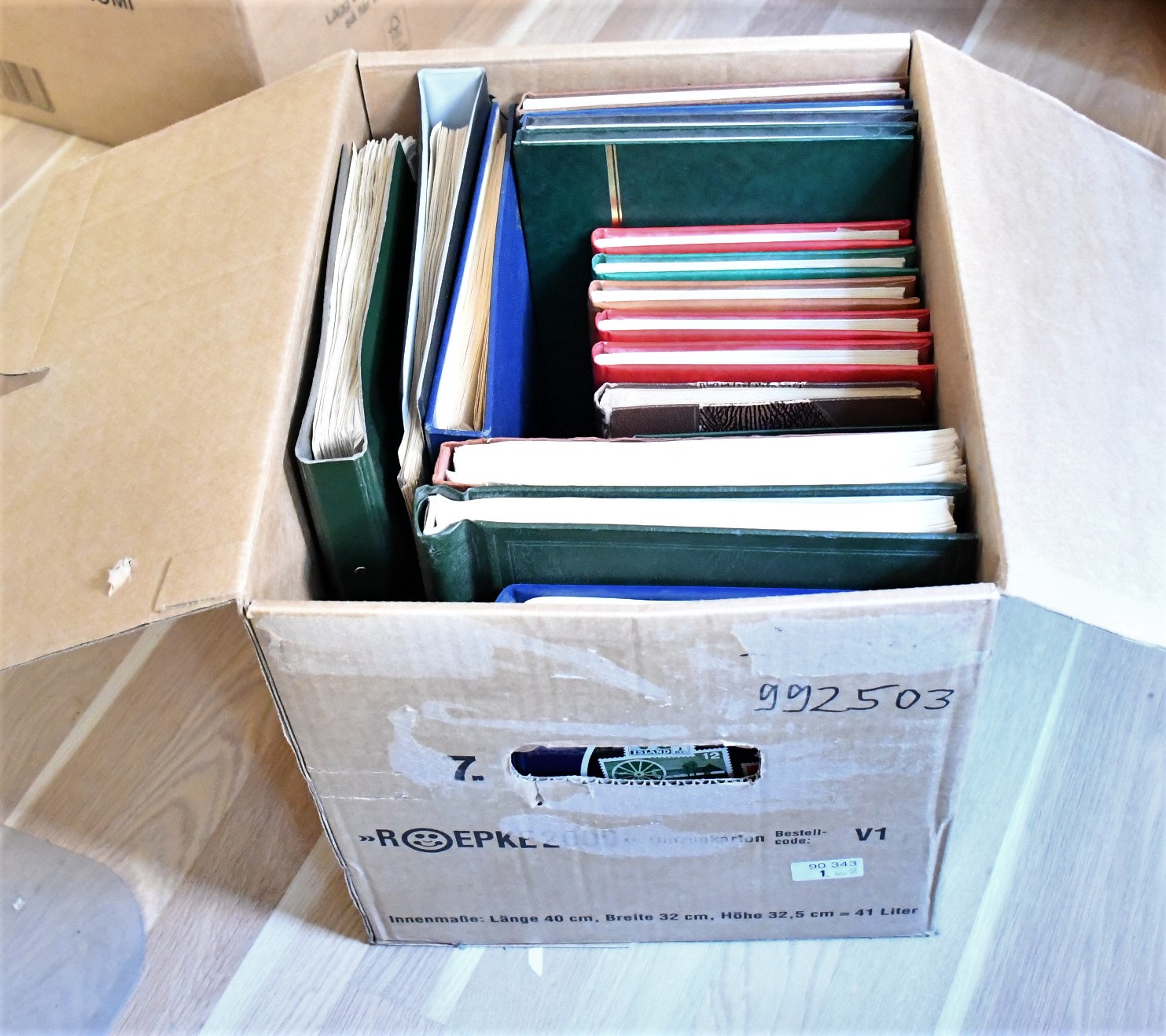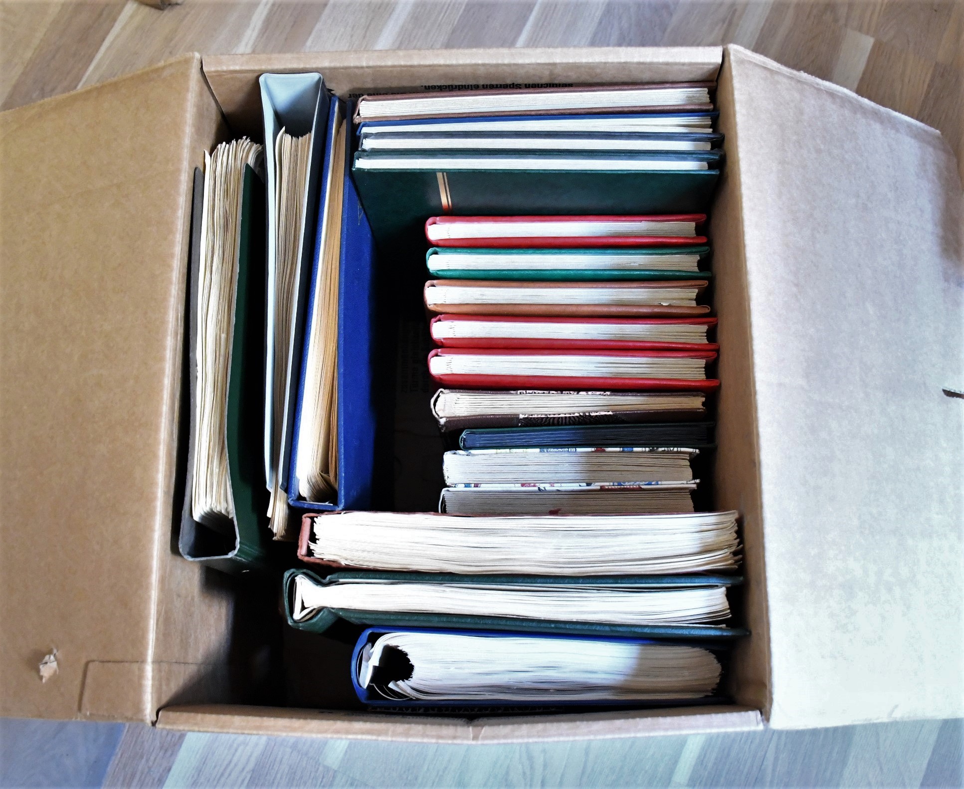 ALL WORLD. Accumulation ★★/★/⊙ old to modern. About 30 various sized stockbooks, album and binders containing youth collections or similar. Stamps, on and off paper, on loose leaves, envelopes and boxes. All housed in two mid-size removal boxes. To be sold in favor of Läkare utan Gränser (MSF). Approx. 27 kg.
