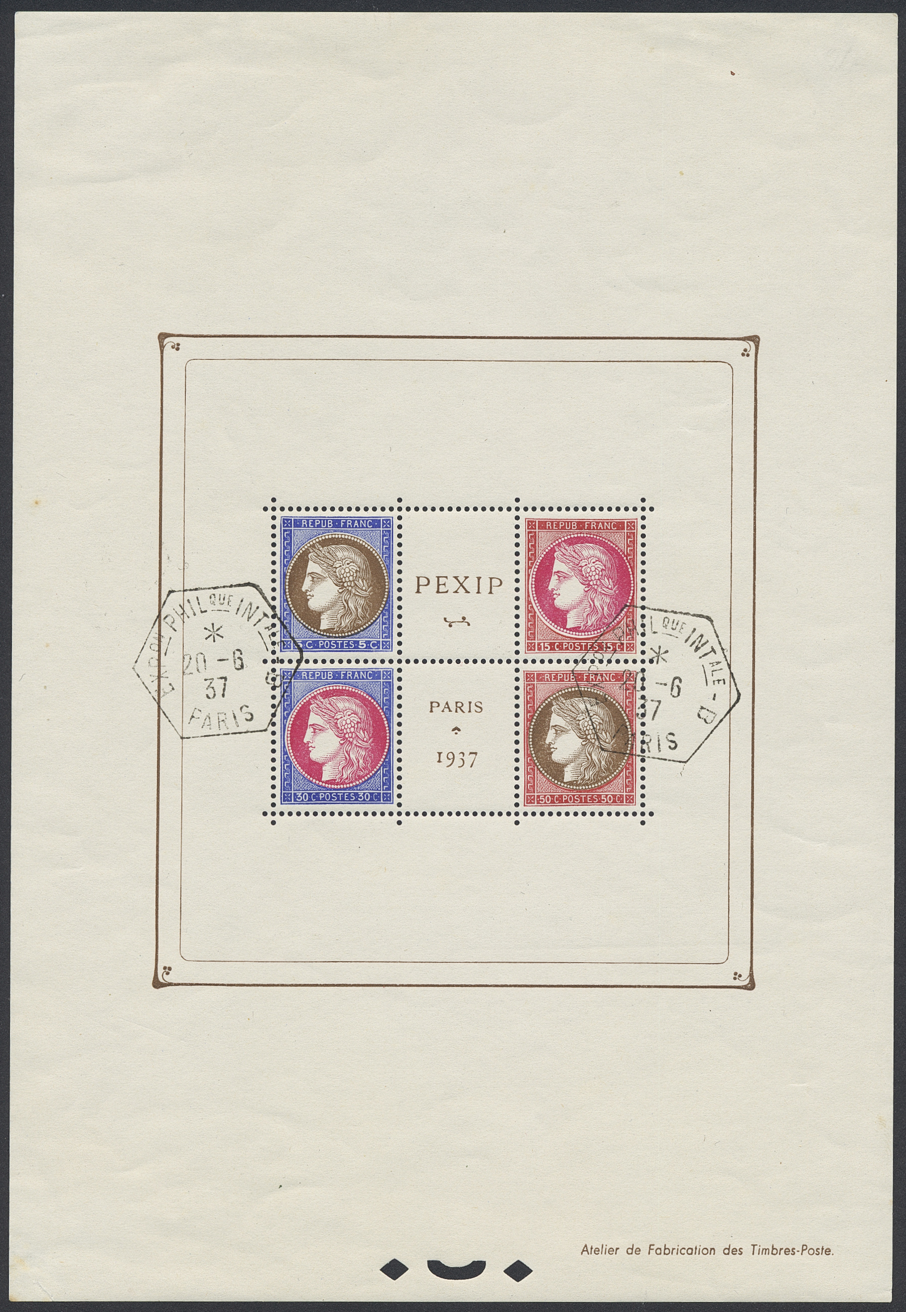 France. Michel 353–56 used, 1937 PEXIP Exhibition souvenir sheet 3. Cancelled at the exhibition, small damages. EUR 350