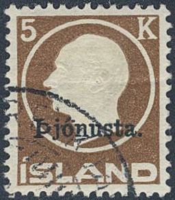 Iceland. Official Facit Tj54 used, 1922 Surcharge Þjonusta 5 Kr brown. SEK 2200