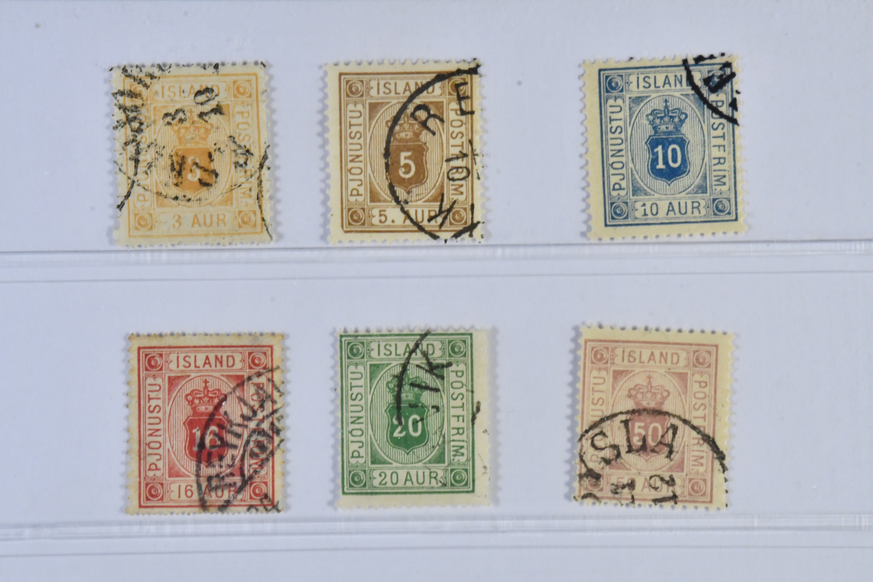 Iceland. Official Facit Tj4–9 used, 1882 Coat-of-Arms 3-50 aur, perf 14 × 13½ (6). SEK 2500