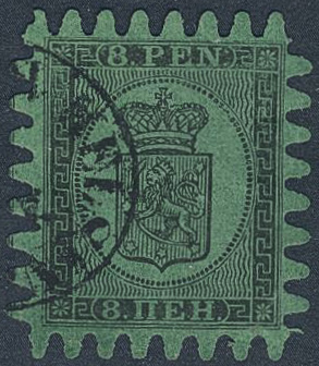 Finland. Facit 6 used, 1866 Coat-of-Arms Finnish values 8 p black on green paper. SEK 1500