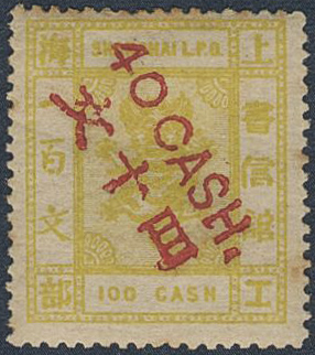 China, locals, Shanghai. Michel 84b II ★, 1886 New value overprint on Dragon 40ca on 100ca yellow, red overprint type II (inverted). Somewhat climate affected. EUR 200