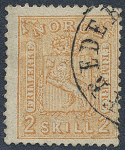 Norway. Facit 6 used, 1863 Coat-of-Arms 2 skilling yellow Off-centered. SEK 2000