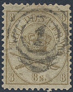 Denmark. Facit 18 used, 1870 Large Oval Type 8 skill yellow-brown, line perf 12½. One somwhat short perf. SEK 4500