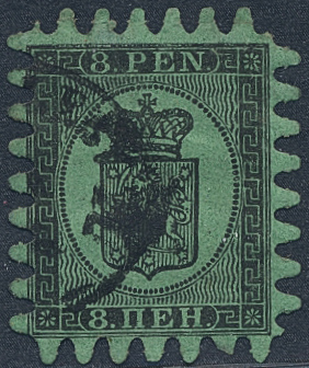 Finland. Facit 6 used, 1866 Coat-of-Arms Finnish values 8 p black on green paper. SEK 1500