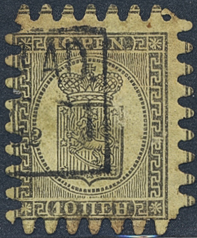 Finland. Facit 7 used, 1866 Coat-of-Arms Finnish values 10 p black on yellow paper. A few misscoloured perfs. SEK 2500