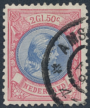 Netherlands. Michel 45aA used, 1893 Queen Wilhelmina 2.50 G lilac-red/light blue perf 11½. EUR 170