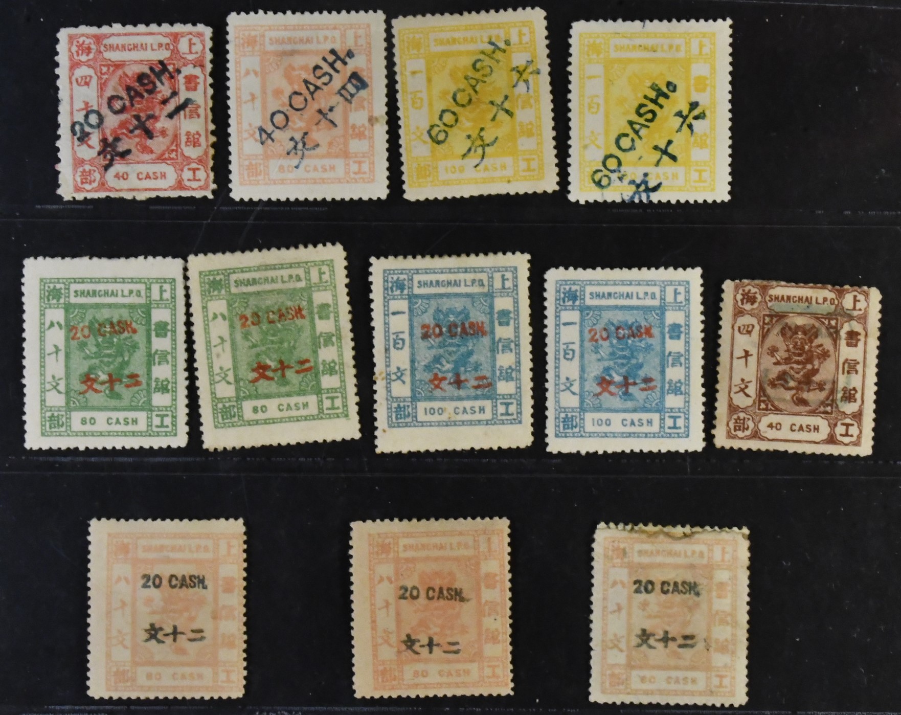 China, locals, Shanghai. ★. 12 stamps with different value overprint. Somewhat mixed quality.