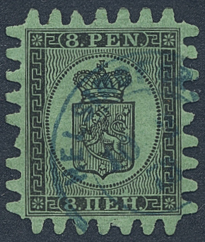 Finland. Facit 6 used, 1866 Coat-of-Arms Finnish values 8 p black on green paper. SEK 1500