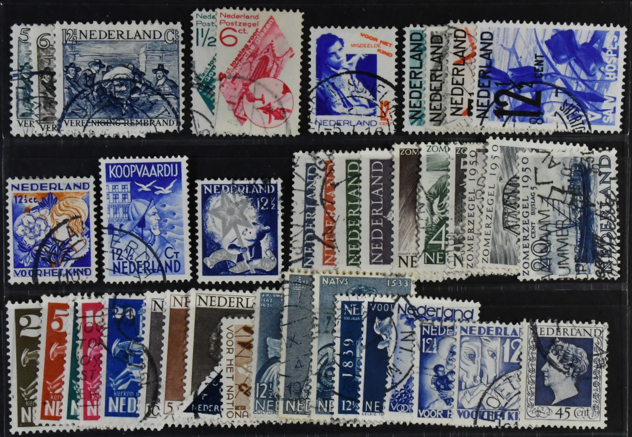 Netherlands. Used 1930–50. All different, e.g. Mi 233-35, 233-44, 248, 249-52, 256, 265, 271, 453-56, 552-57, 558-62. Mostly good quality. Mi € 504 (42)